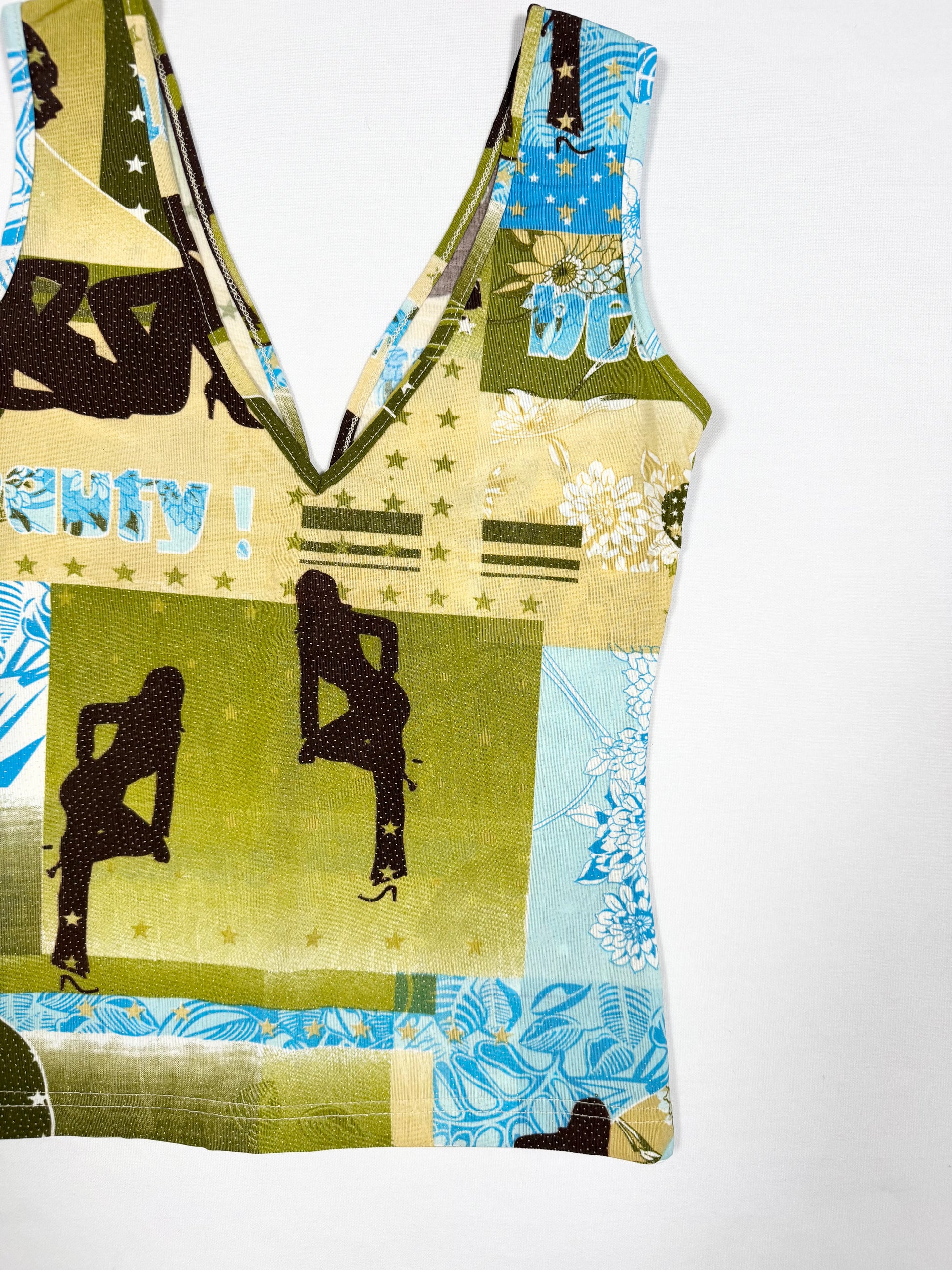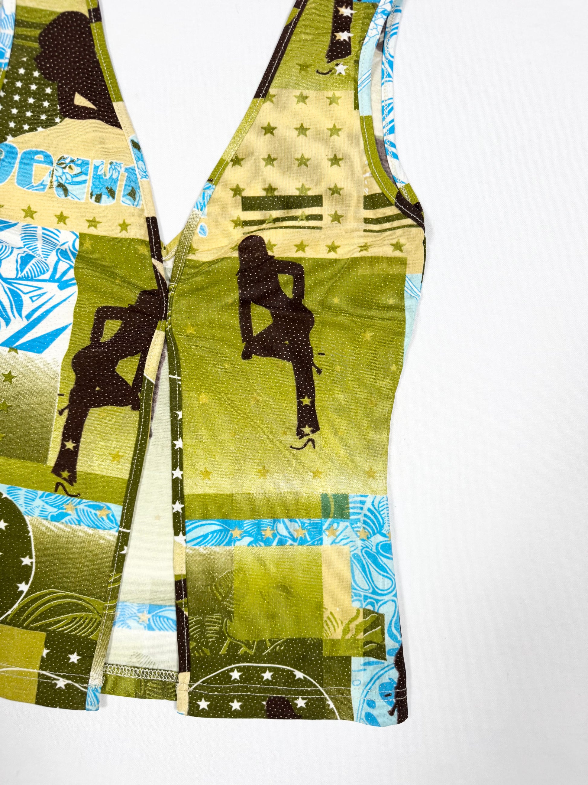 Super cute 00s tank with cut out that can be worn at the front or back🤍Green with cool print design🤍