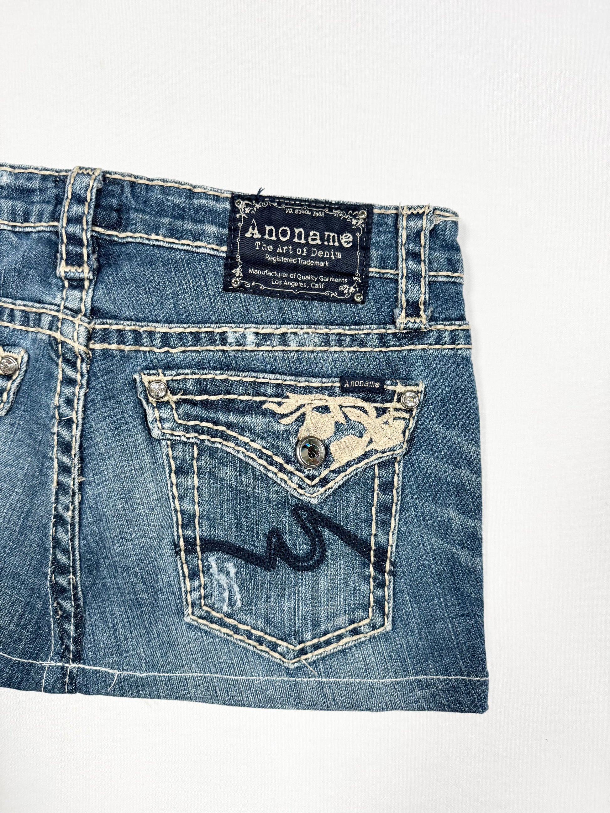 00s low rise denim mini skirt with contrast stitching and cute fold over back pockets🤍