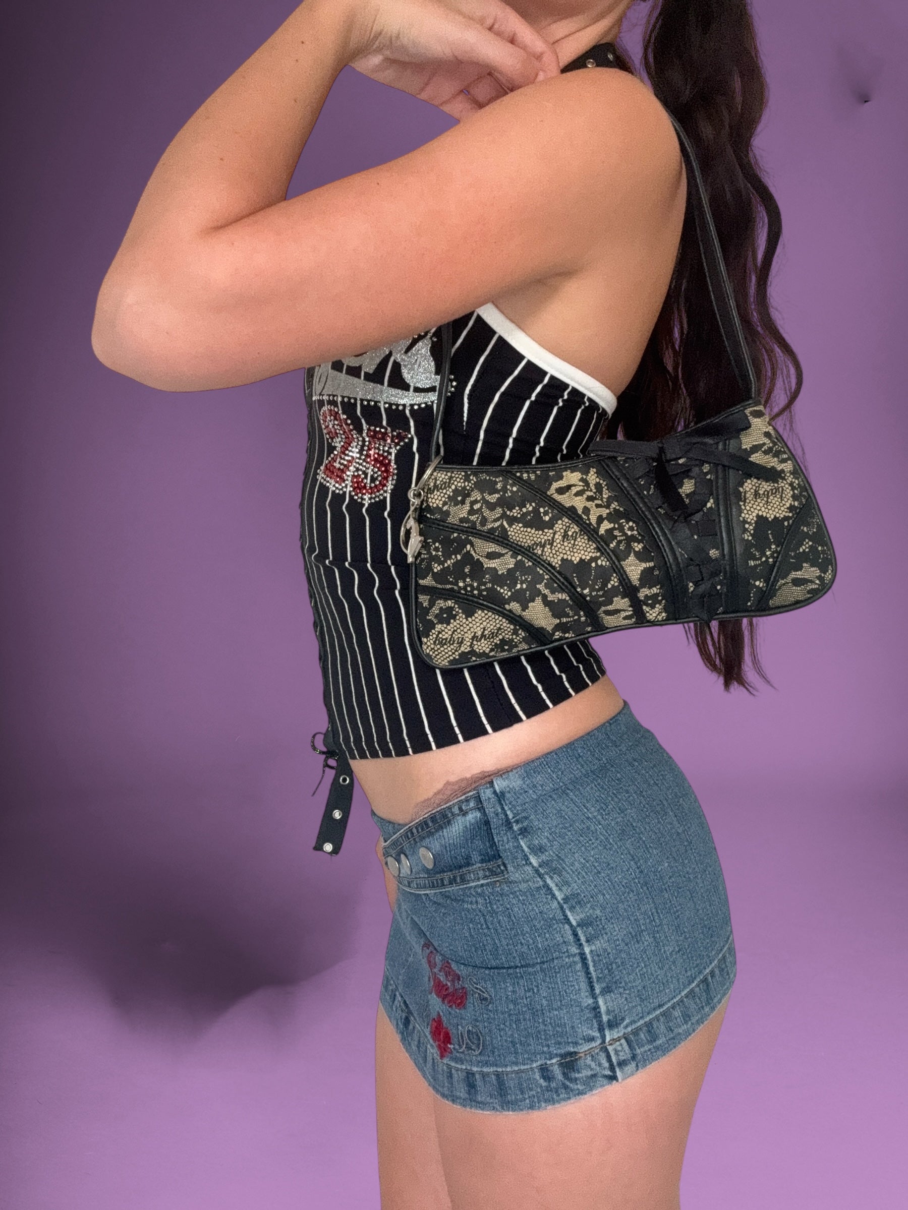 Super cute 00s baby phat shoulder bag🖤Black and beige lace print with logo🖤Mental hardware logo charm attached🖤Black satin ribbon corset detail🖤