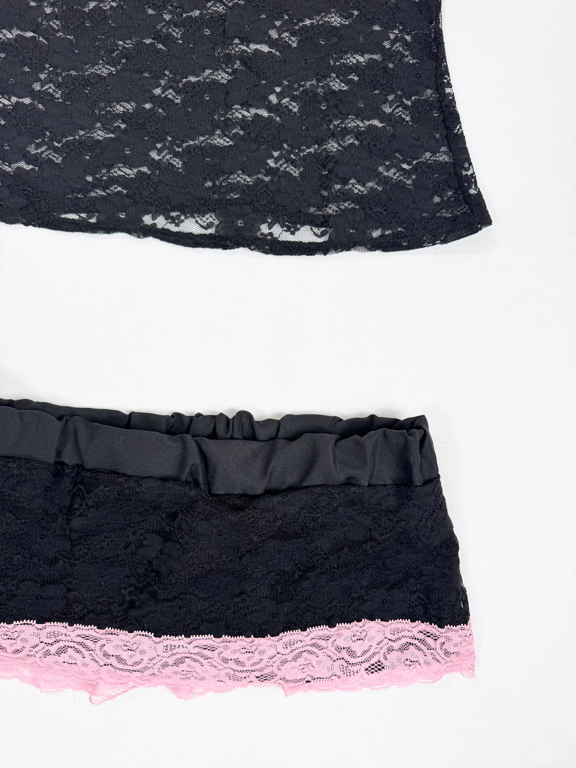 Hot 00s black lace cami and skirt set with pink lace trim🩷