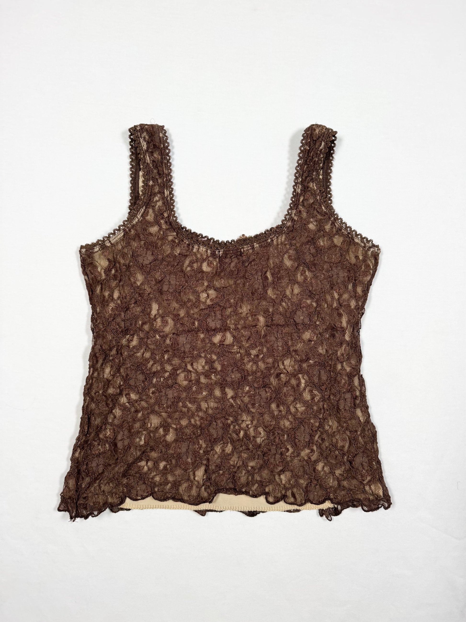 Adorable 00s brown lace boneless corset tank🤎Pretty flower neckline trim🤎