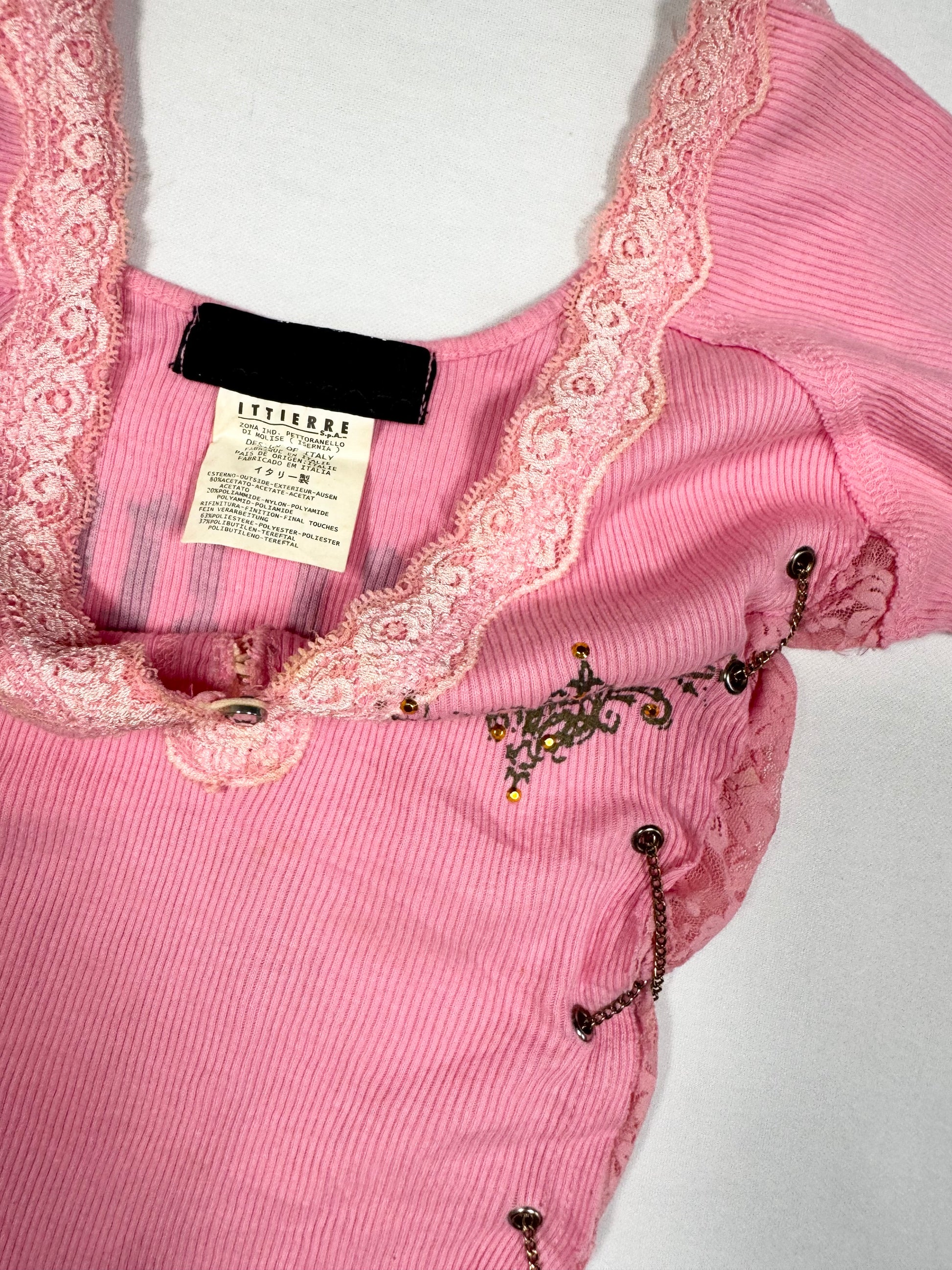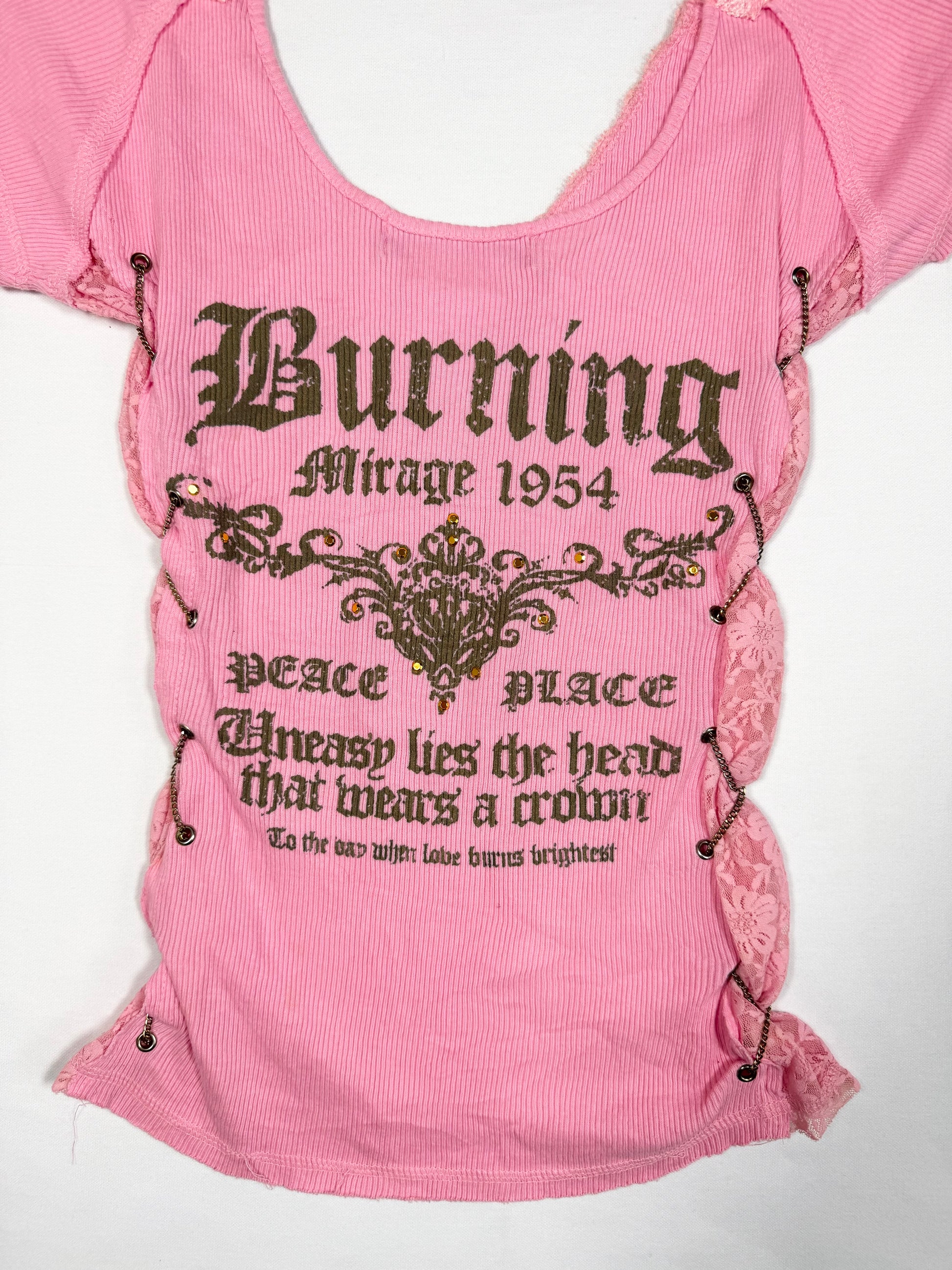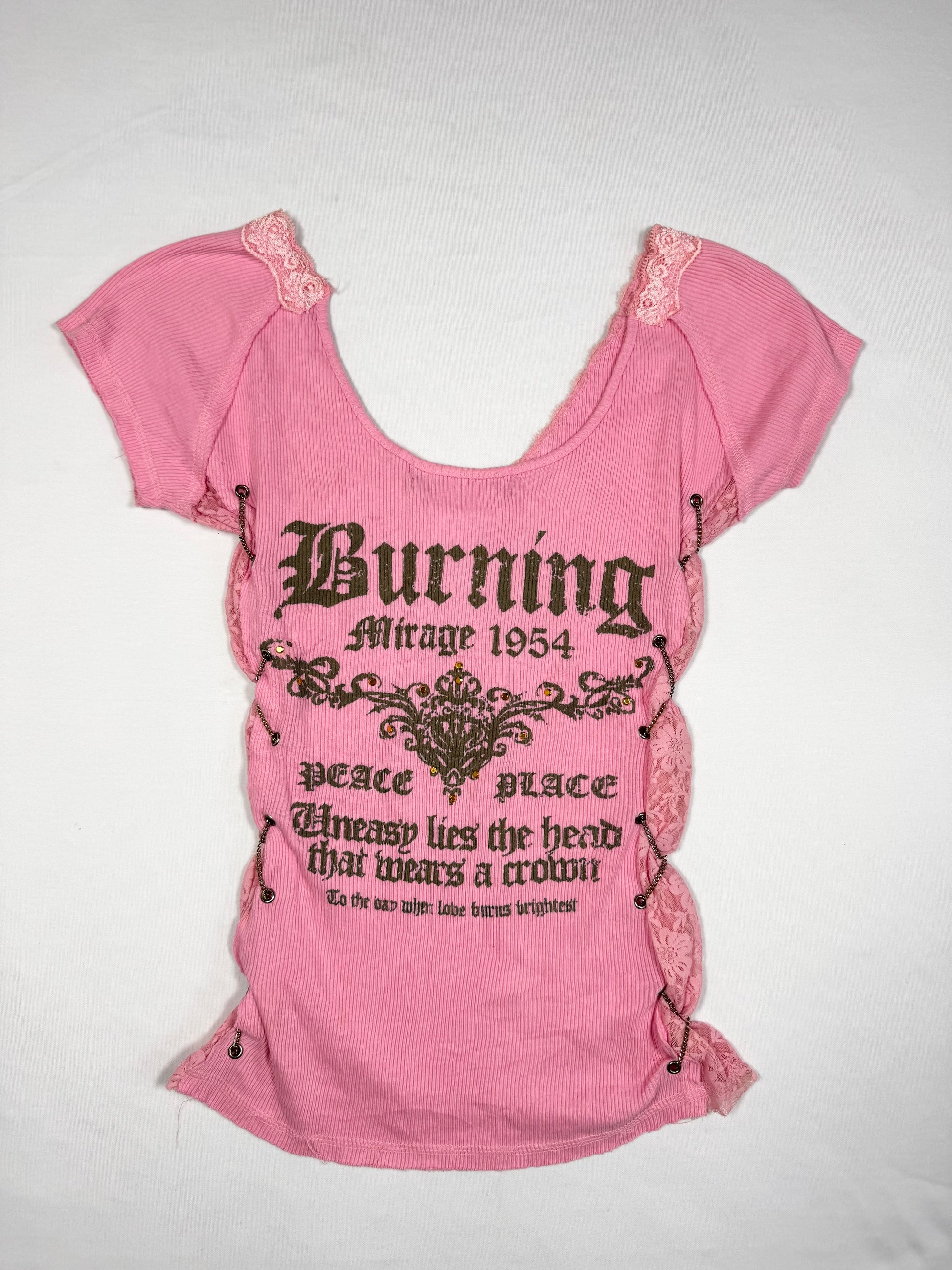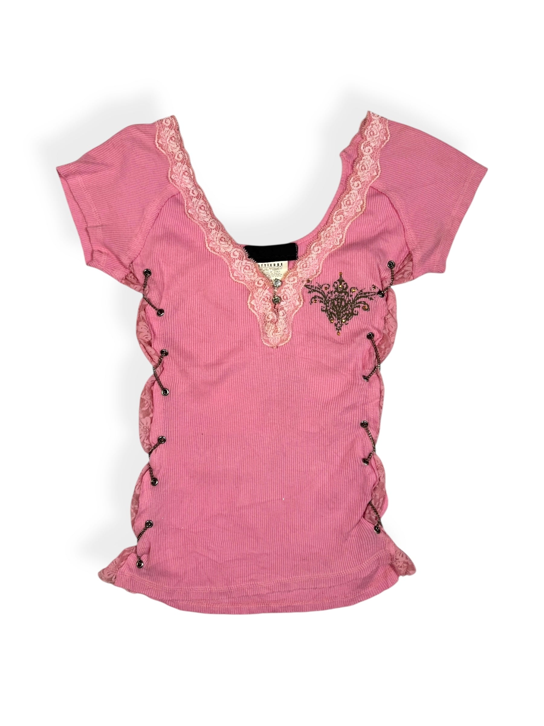 Insane 00s pink tee with chain lace up sides🩷Grunge graphic print on the back and front🩷Lace trim🩷