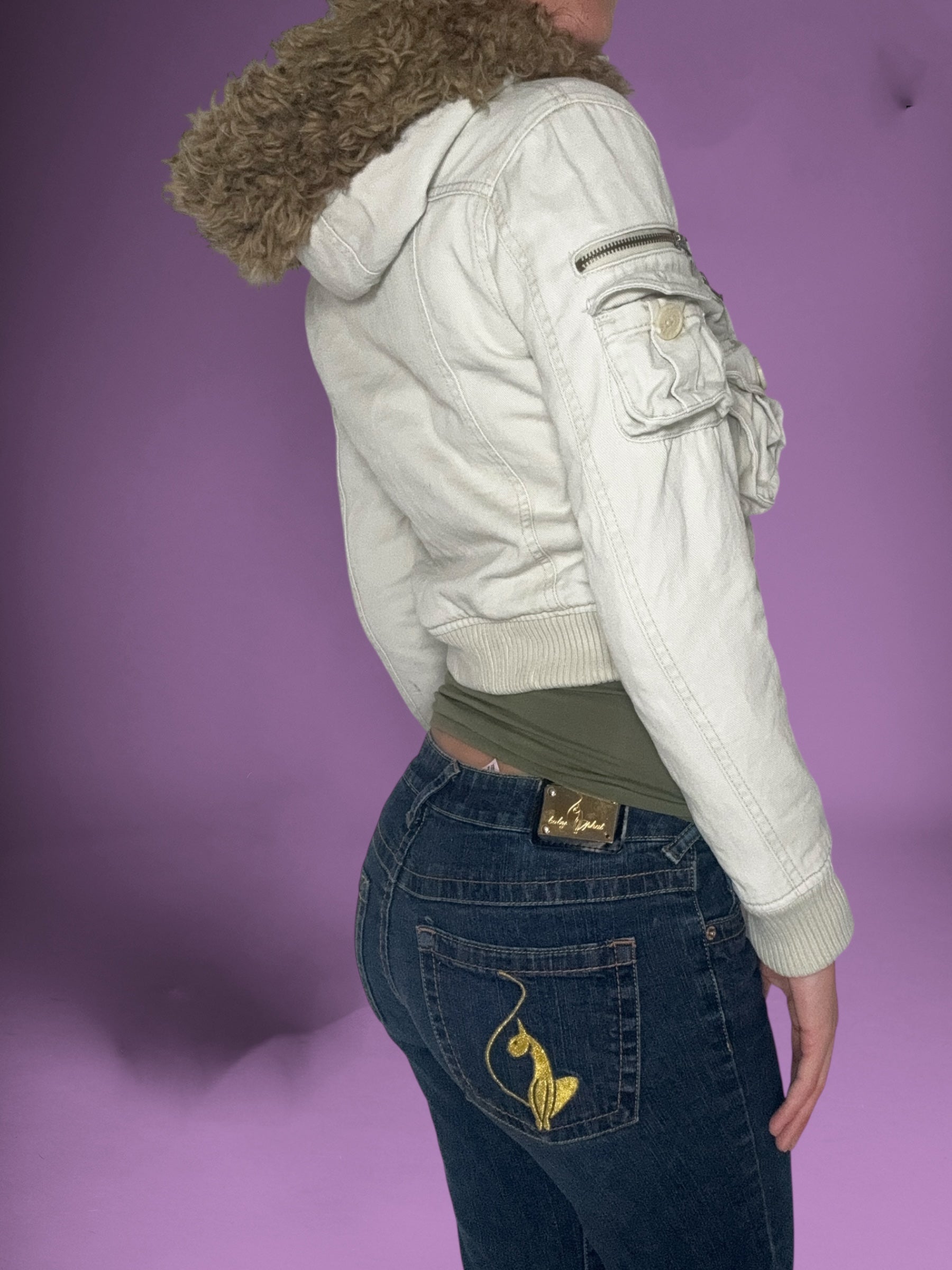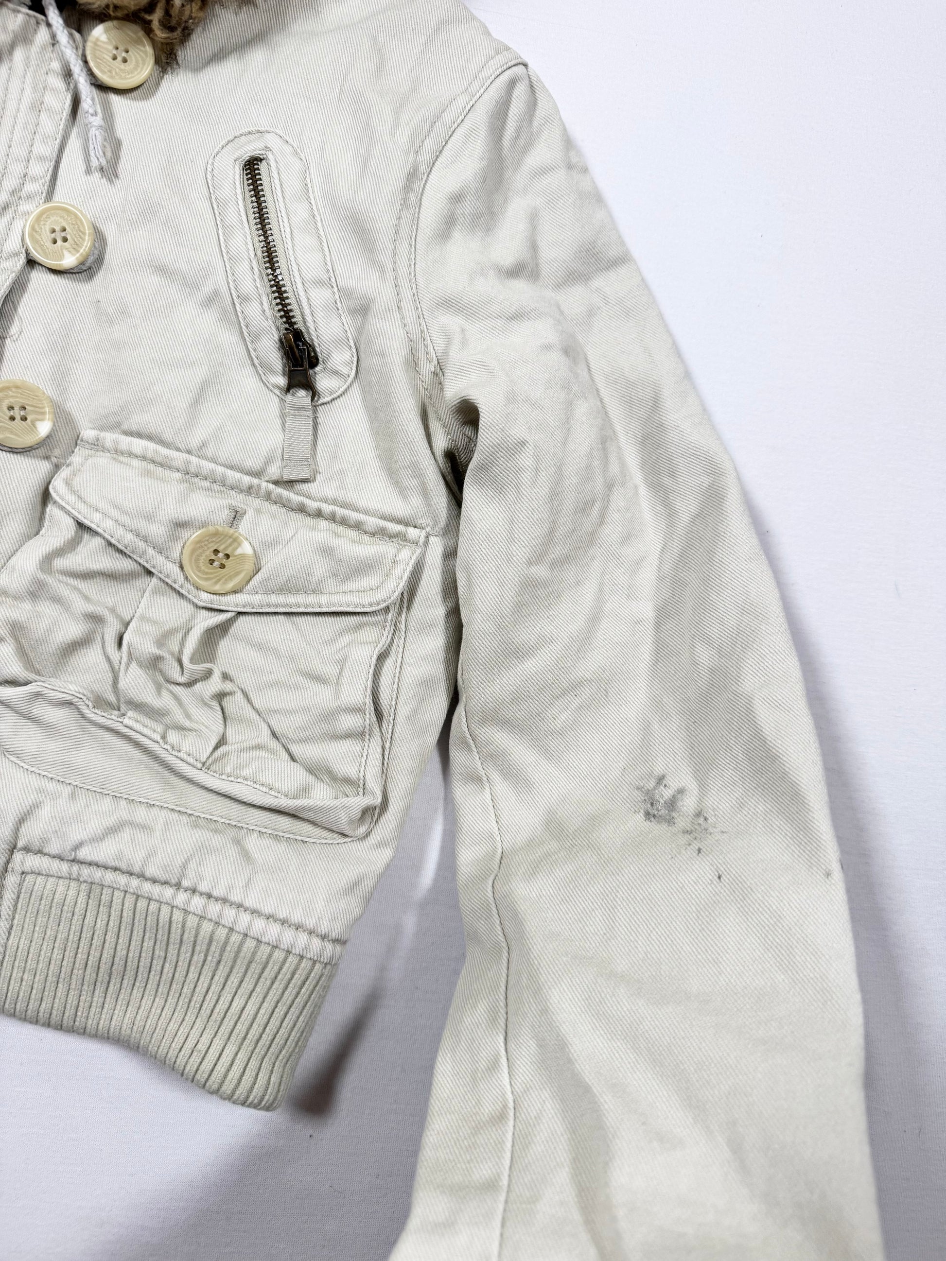 Cutest 00s “angel denim” brand beige cropped jacket with fur hood🤍Button up front details🤍