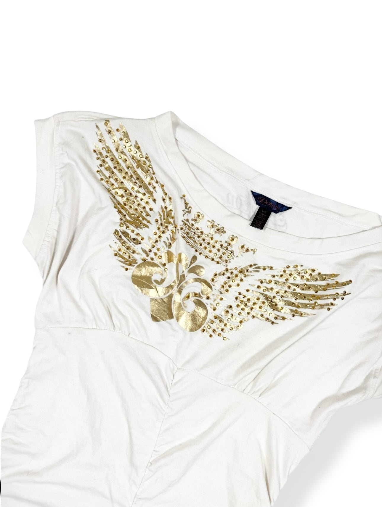 Stunning 00s dereon white t shirt grunge dress🤍Hold wing print design on the front🤍Off shoulder style with ruched torso🤍