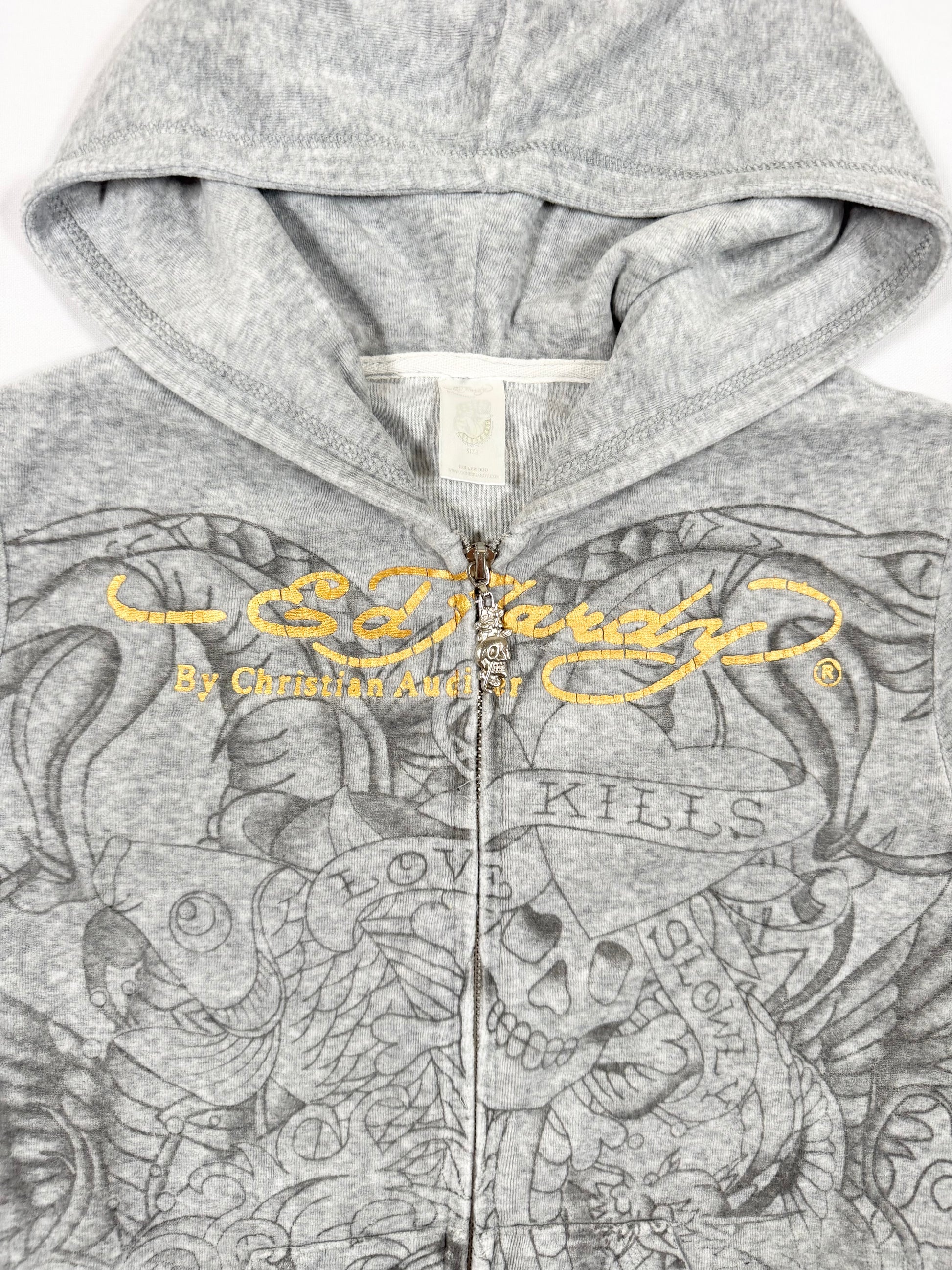 stunning 00s grey Ed hardy velour tracksuit set♥️Dark grey print and Diamante design on the back♥️Gold logo details♥️
