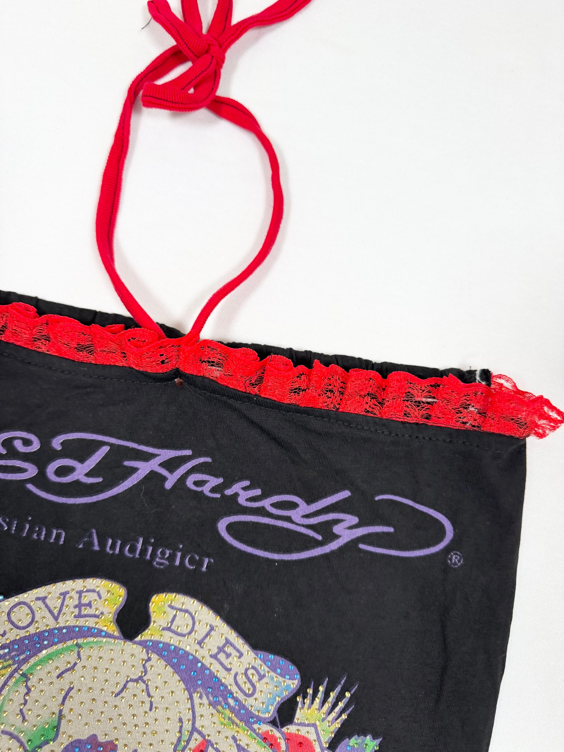 Prettiest 00s reworked Ed hardy dress♥️Black with red ruffle trip and halter strap♥️Purple logo and Diamante print on the front♥️