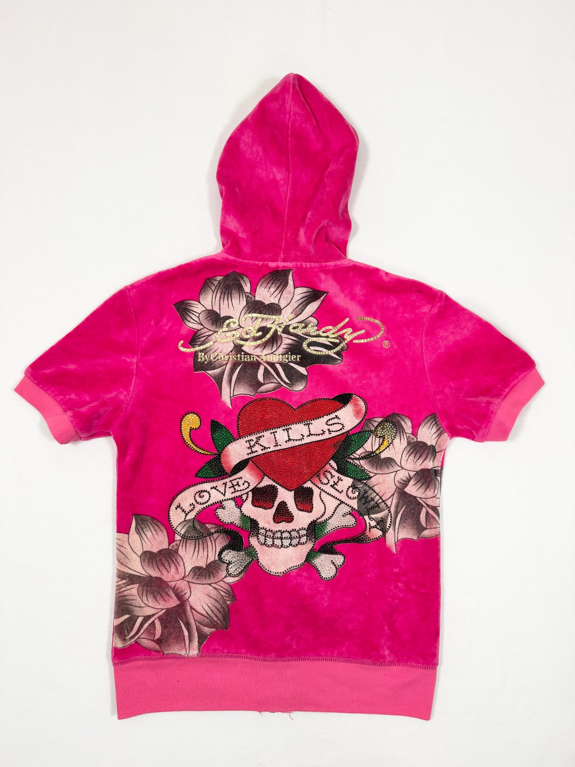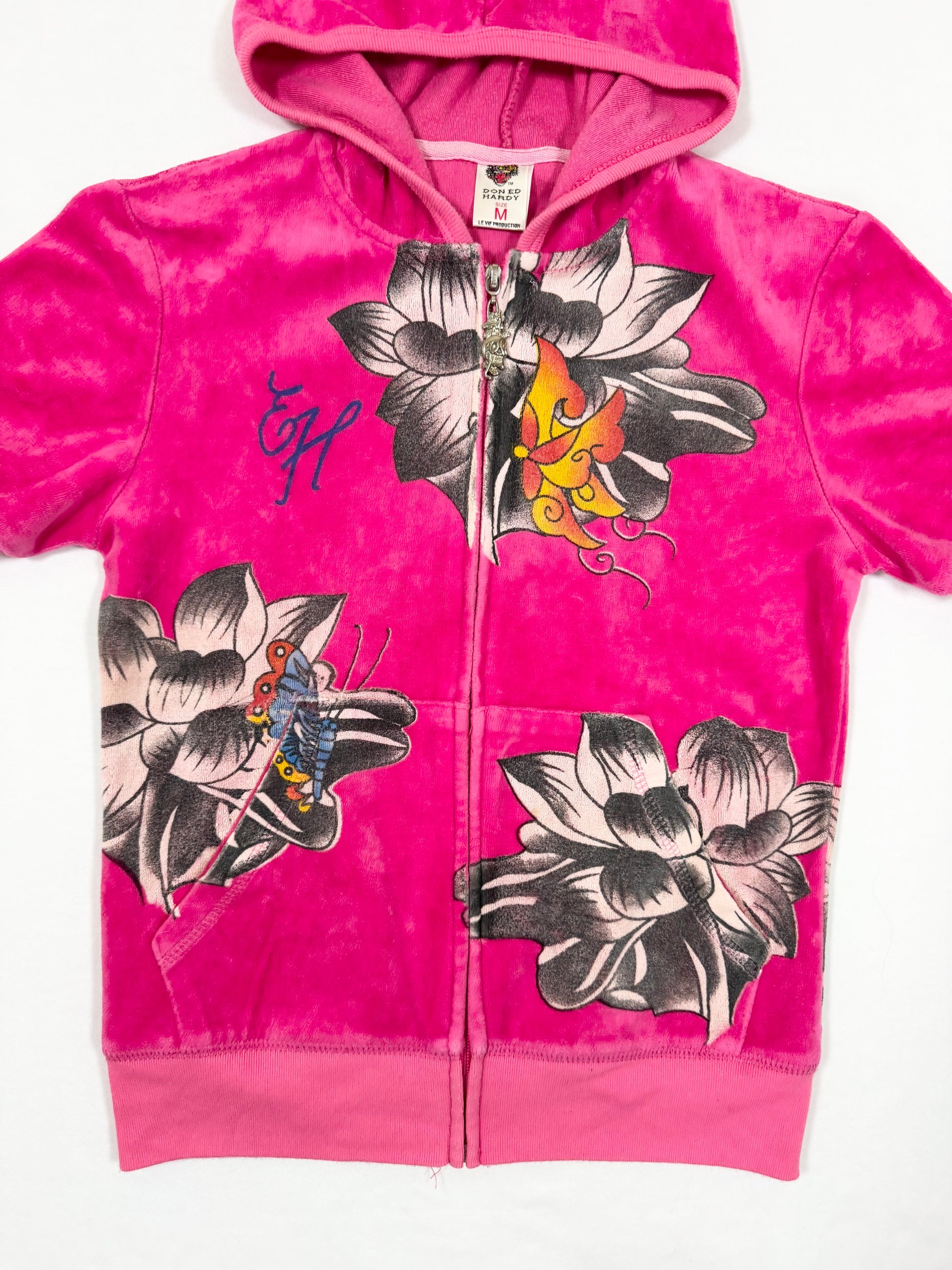 Adorable and rare 00s Ed hardy pink velour short tracksuit set💗Butterfly, Diamante love kills slowly and lotus print designs💗Spell out logo across the back of shorts💗