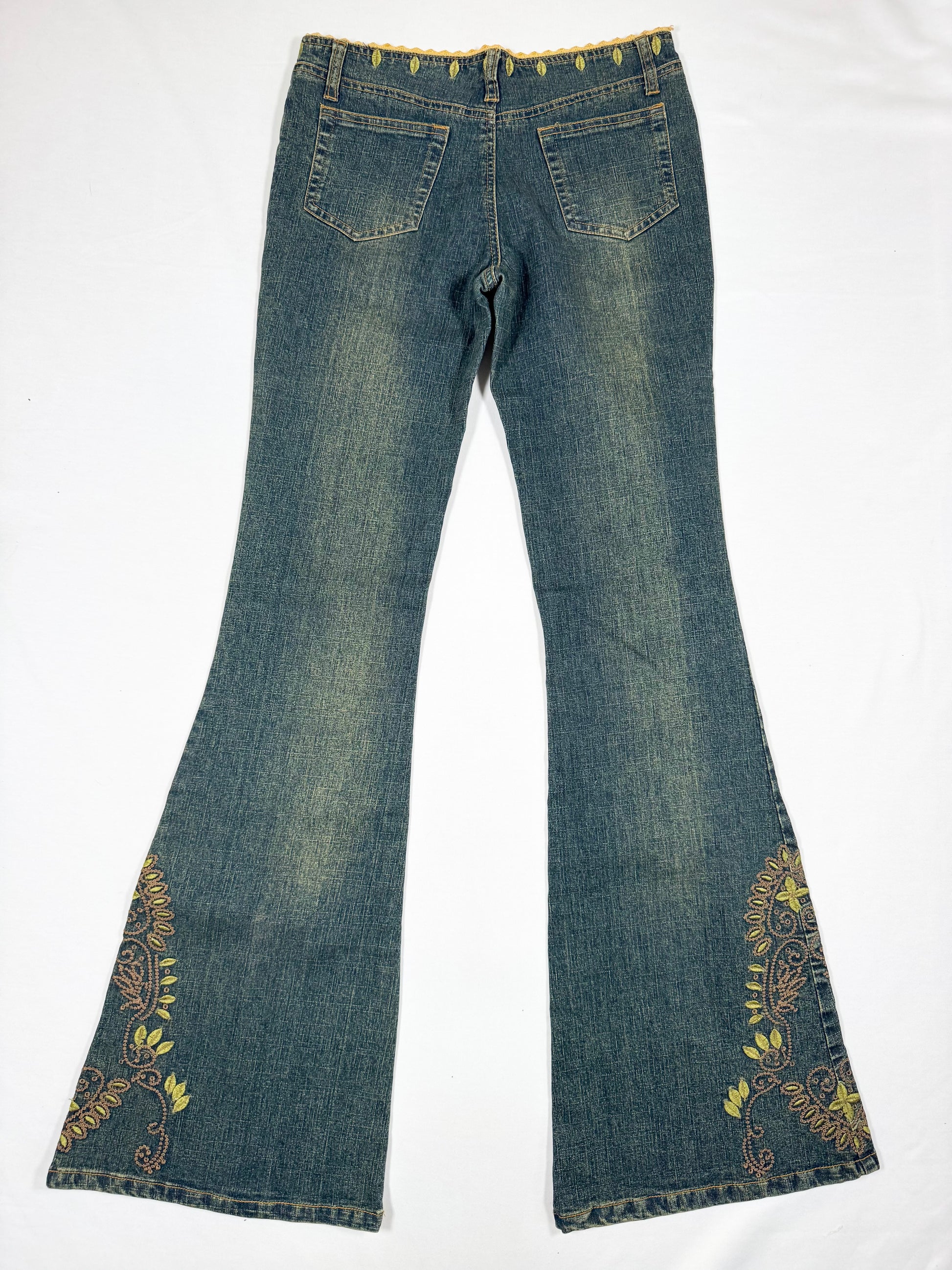 Prettiest 00s low rise flared jeans with embroidered designs🤎