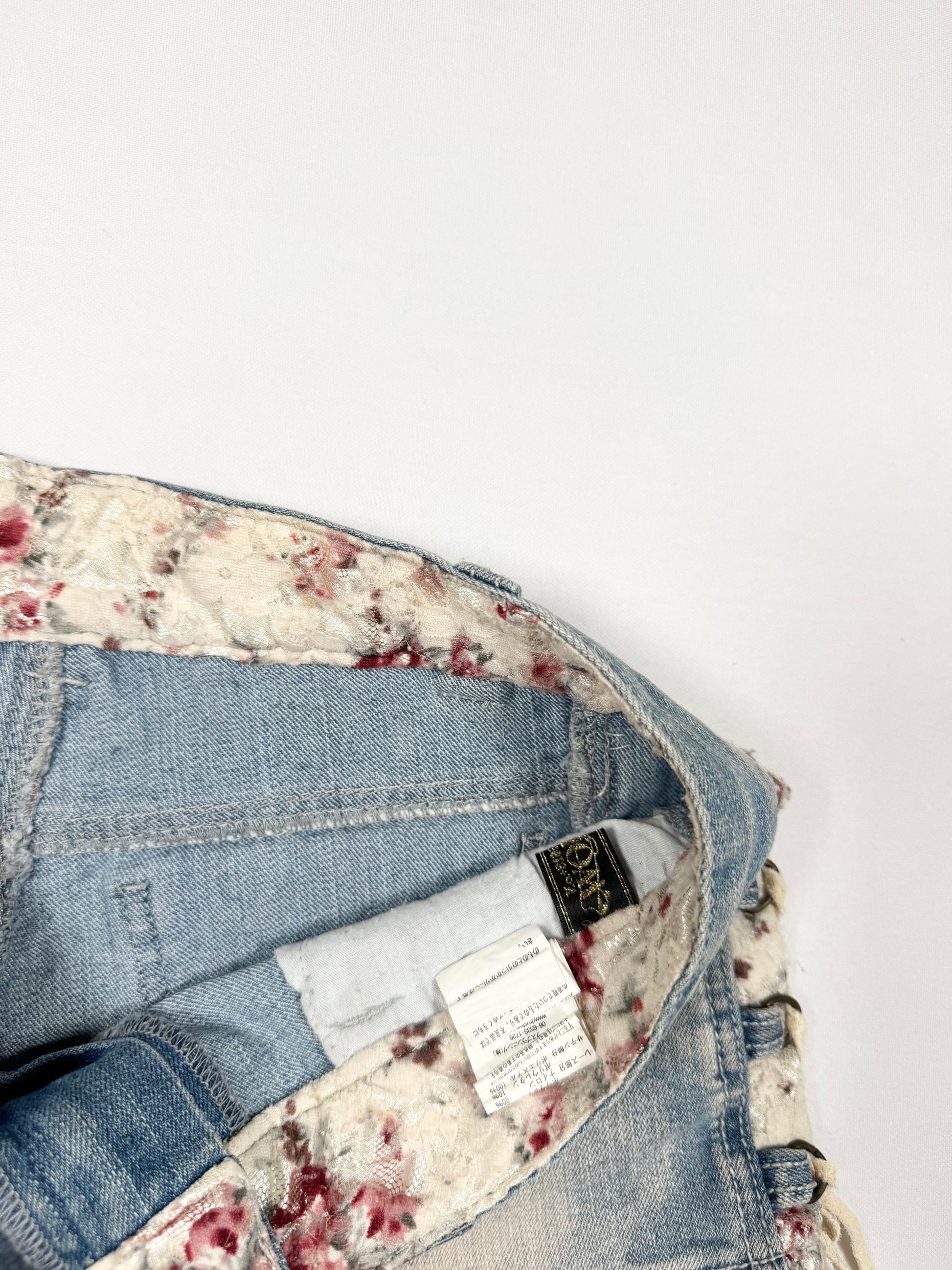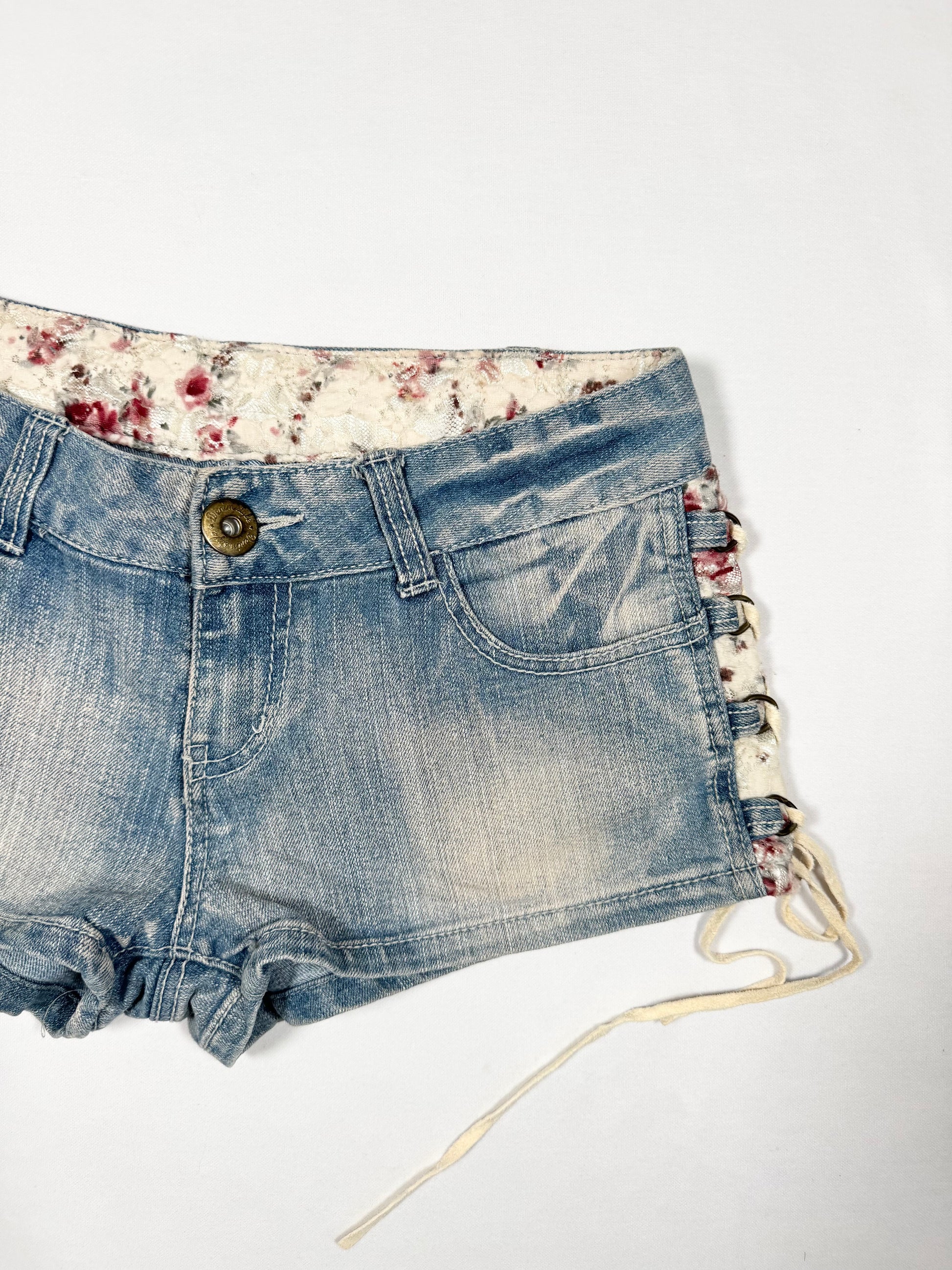 Cute 00s low rise lightwash denim mini shorts with floral lace sides🤍Lace up sides🤍