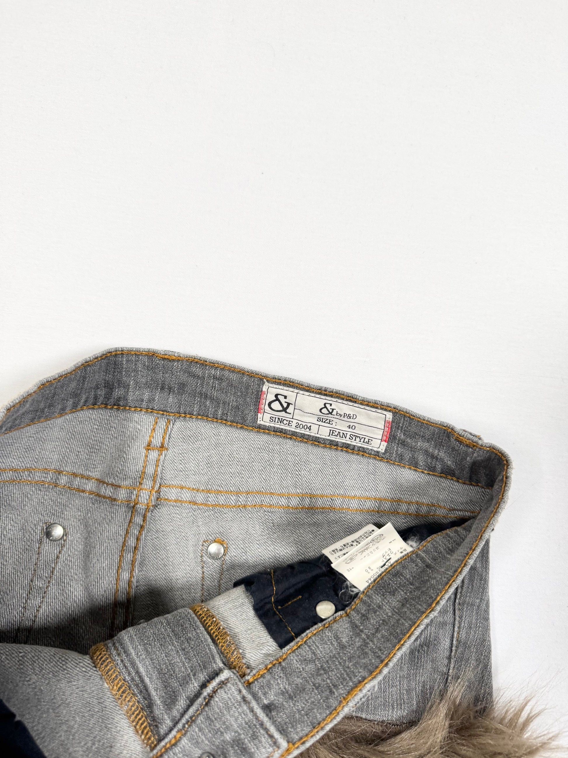 Super cute 00s low rise grey denim mini shorts with plaid pockets and fur trim🤍