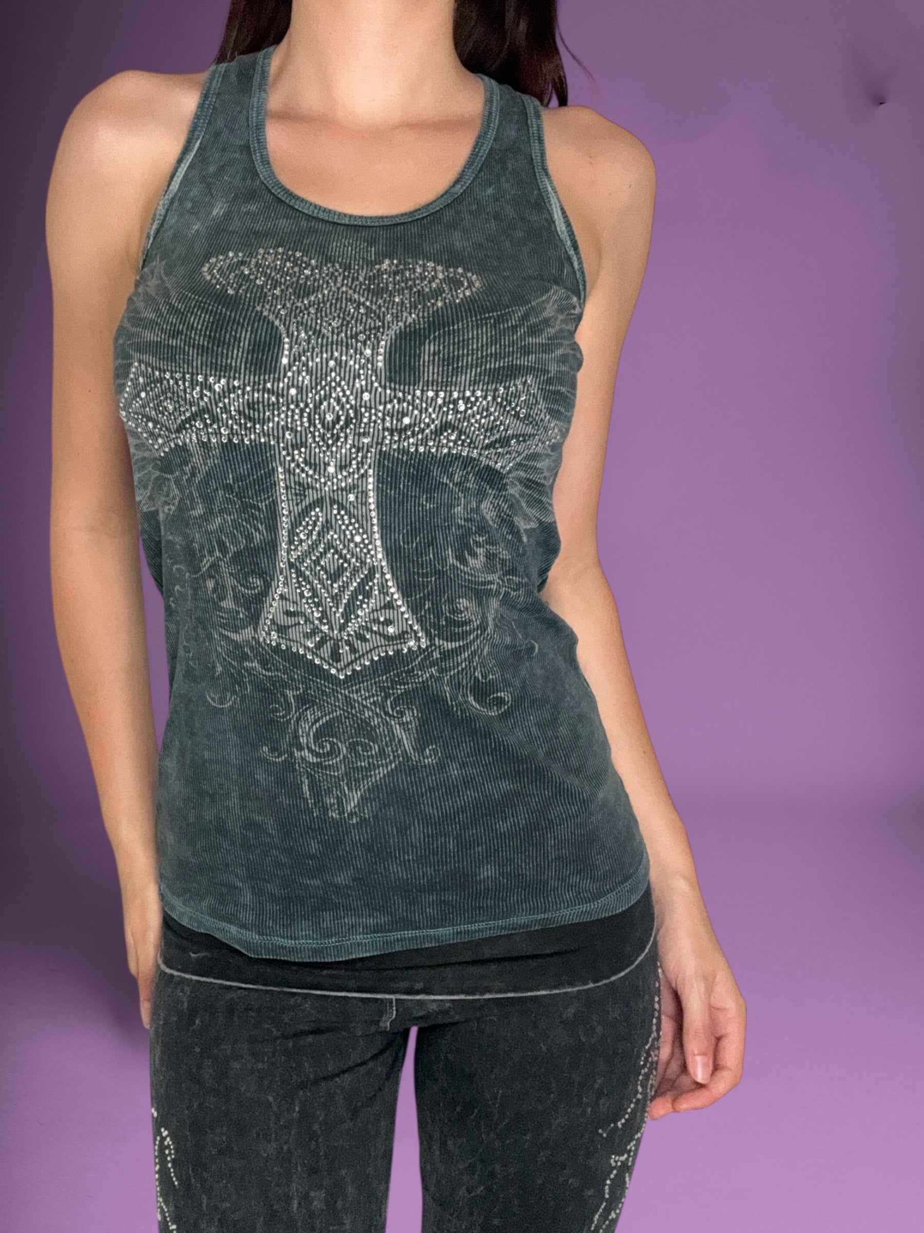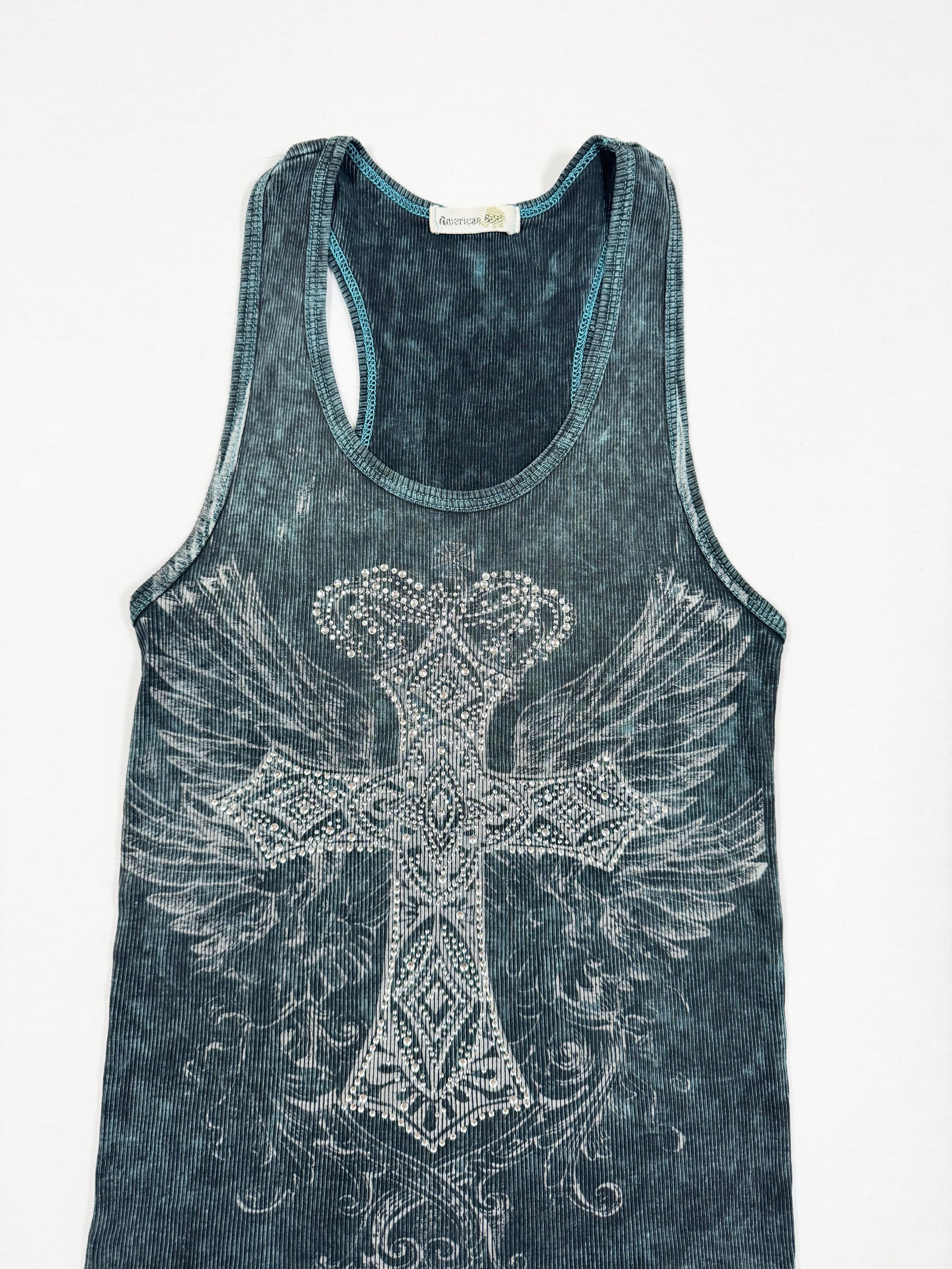 Insane 00s acid wash grunge tank with Diamante cross on the front🖤