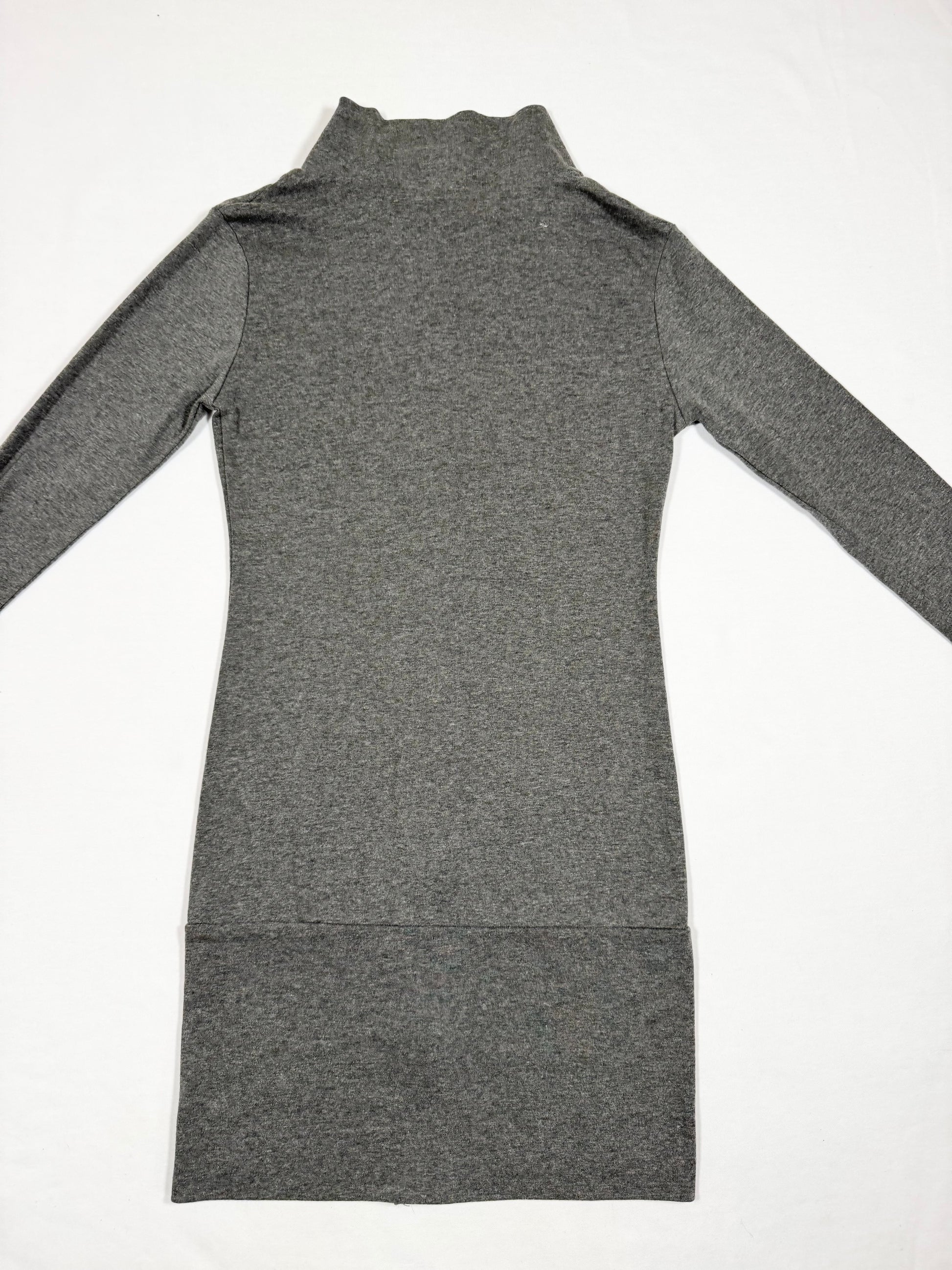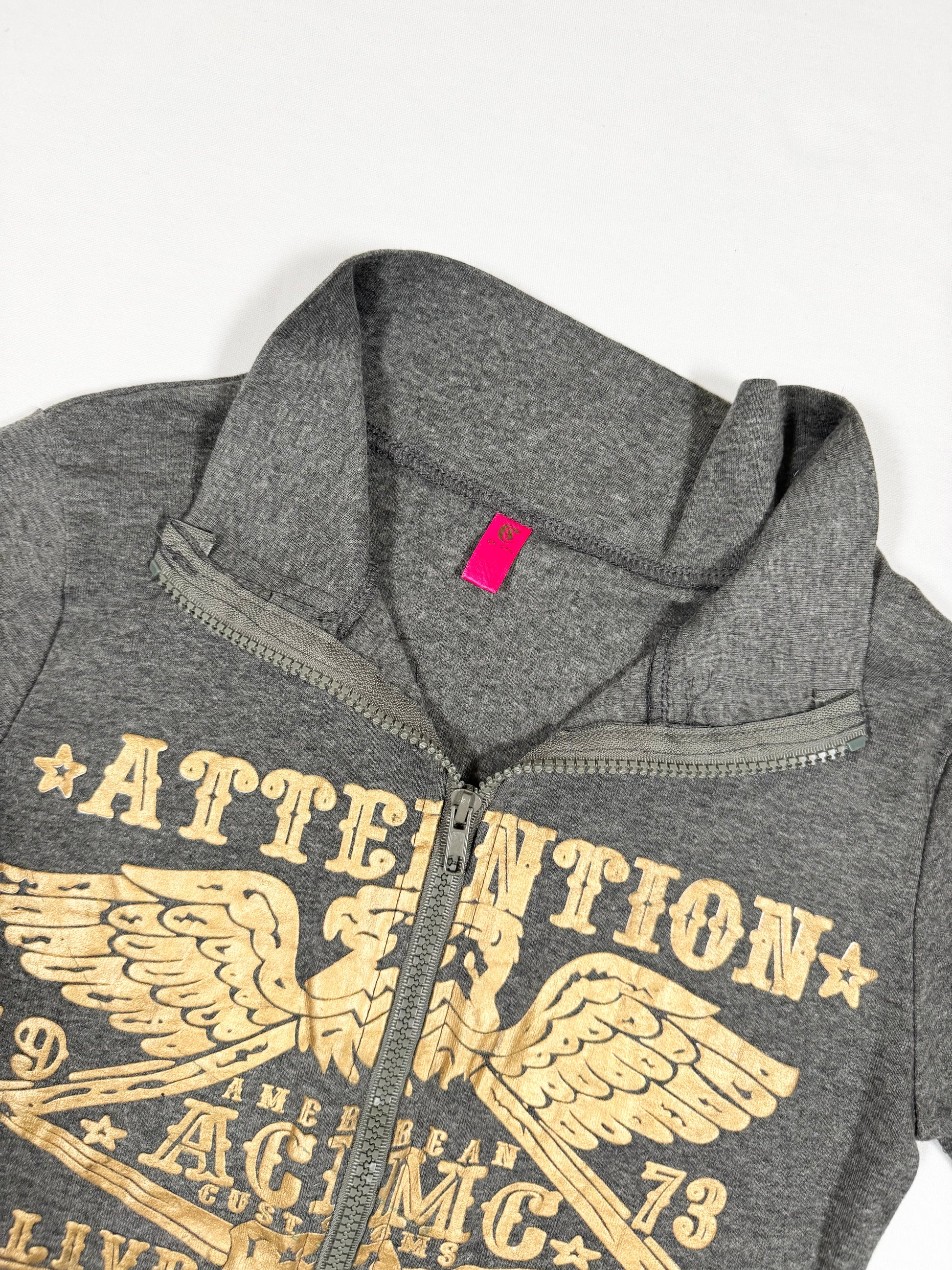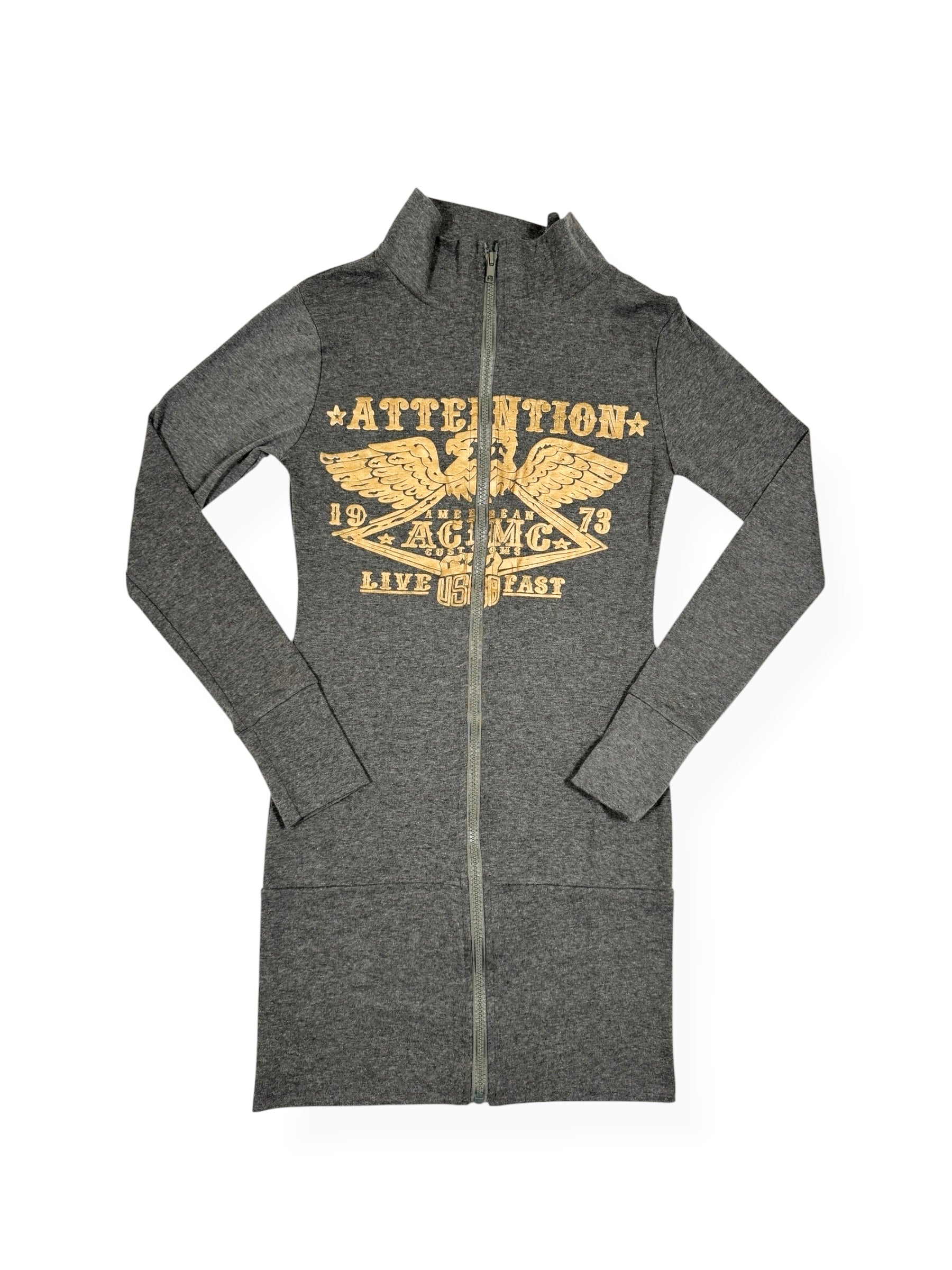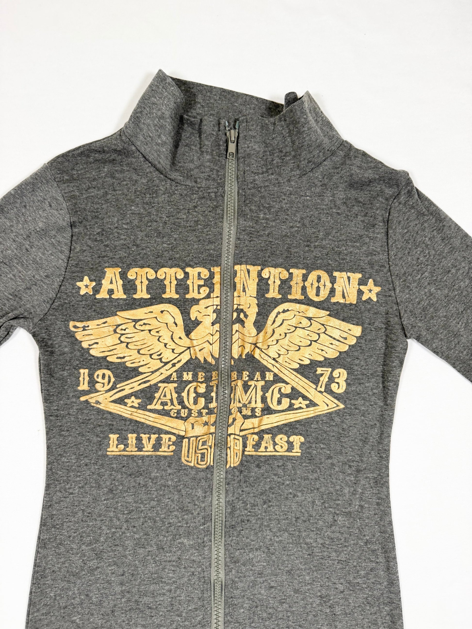 Cute 00s grey zip up long sleeved dress with gold print grunge design🤍
