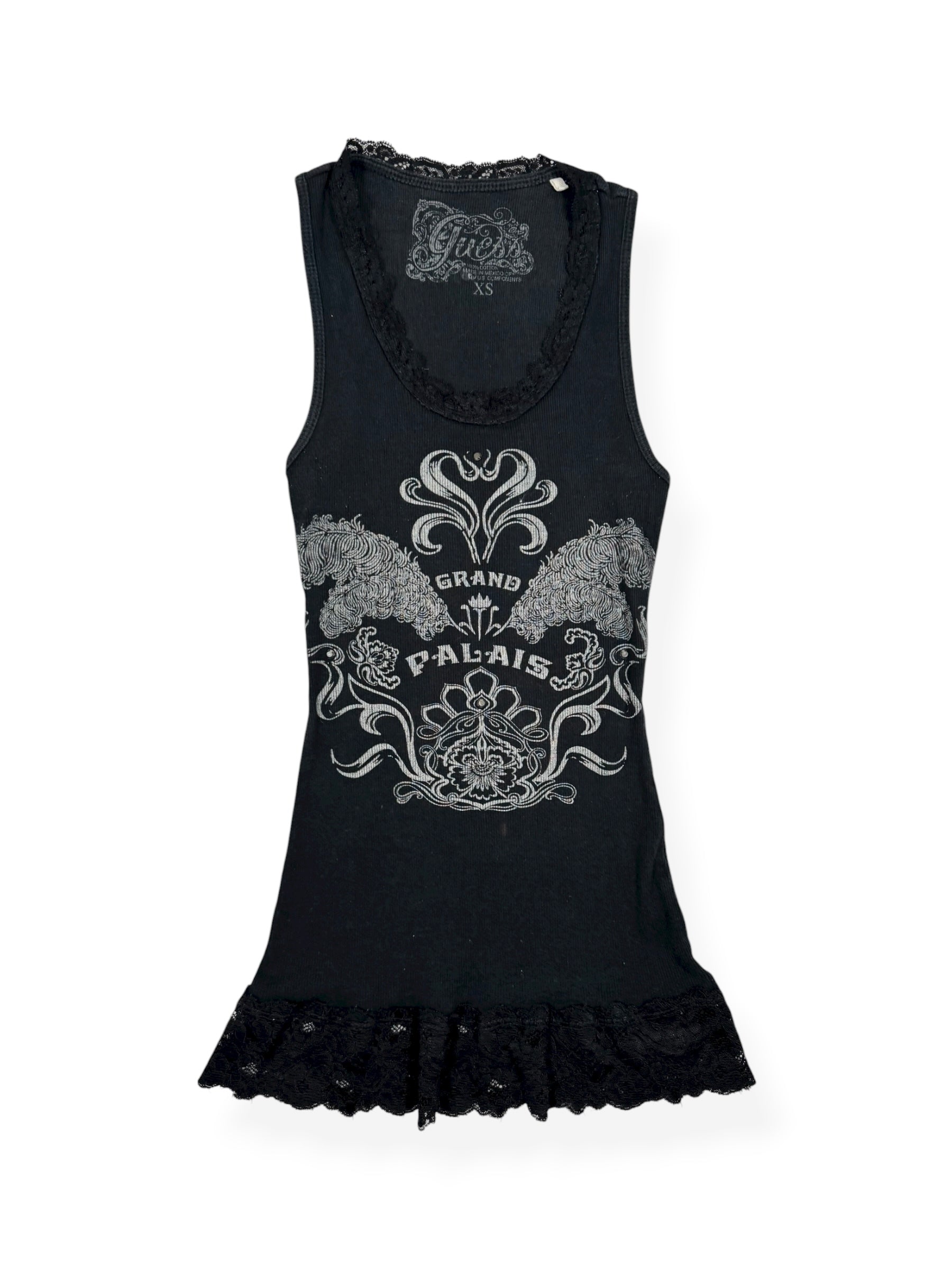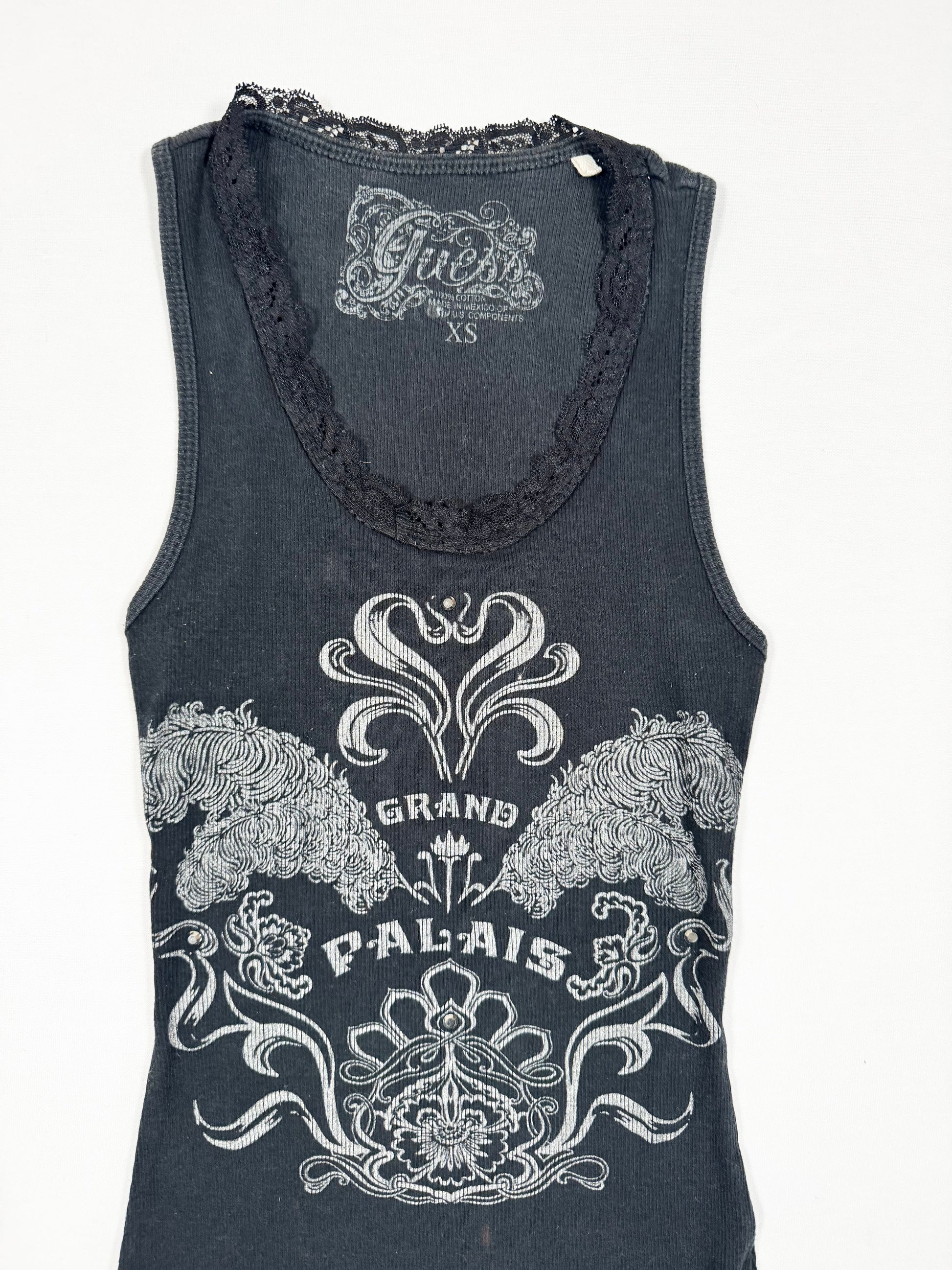 Stunning 00s guess black ribbed tank with lace trim🖤grey design on the front and logo on the back🖤
