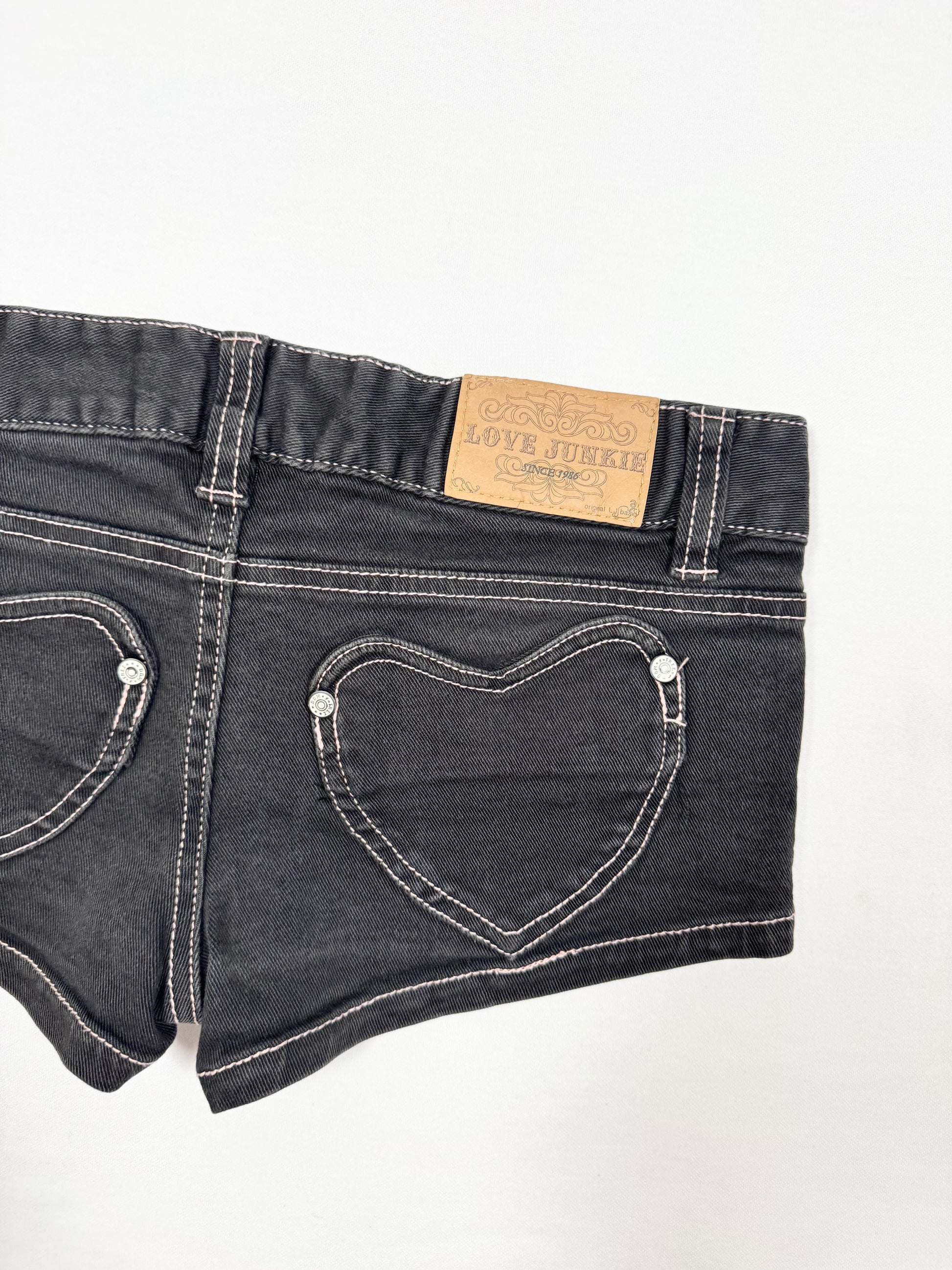 Adorable 00s “love junkie” low rise black faded denim mini shorts🩷Pink contrast stitching🩷Cute heart back pockets🩷