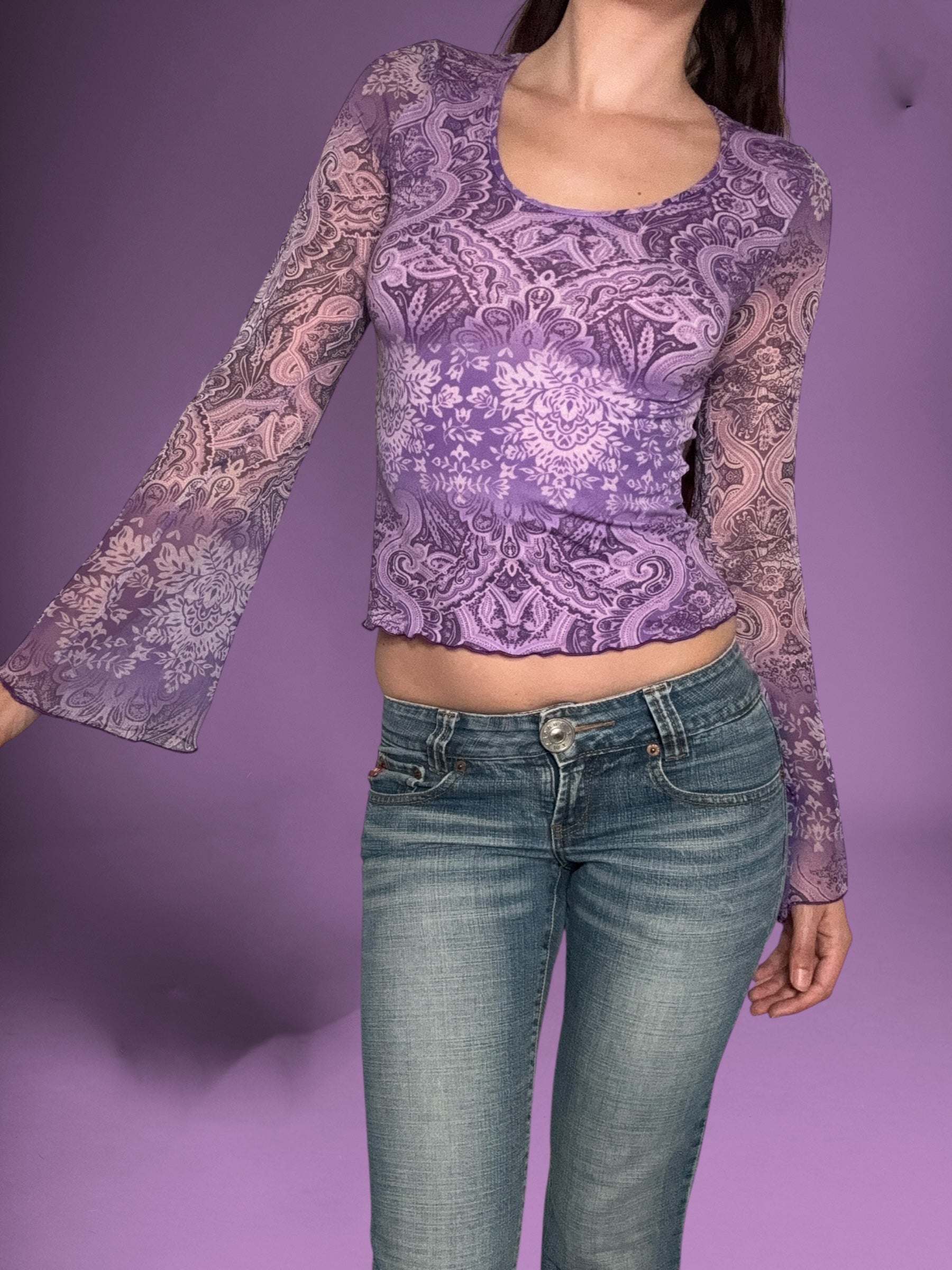 Prettiest 00s Jennyfer purple long sleeved top with micromesh bell sleeves💜