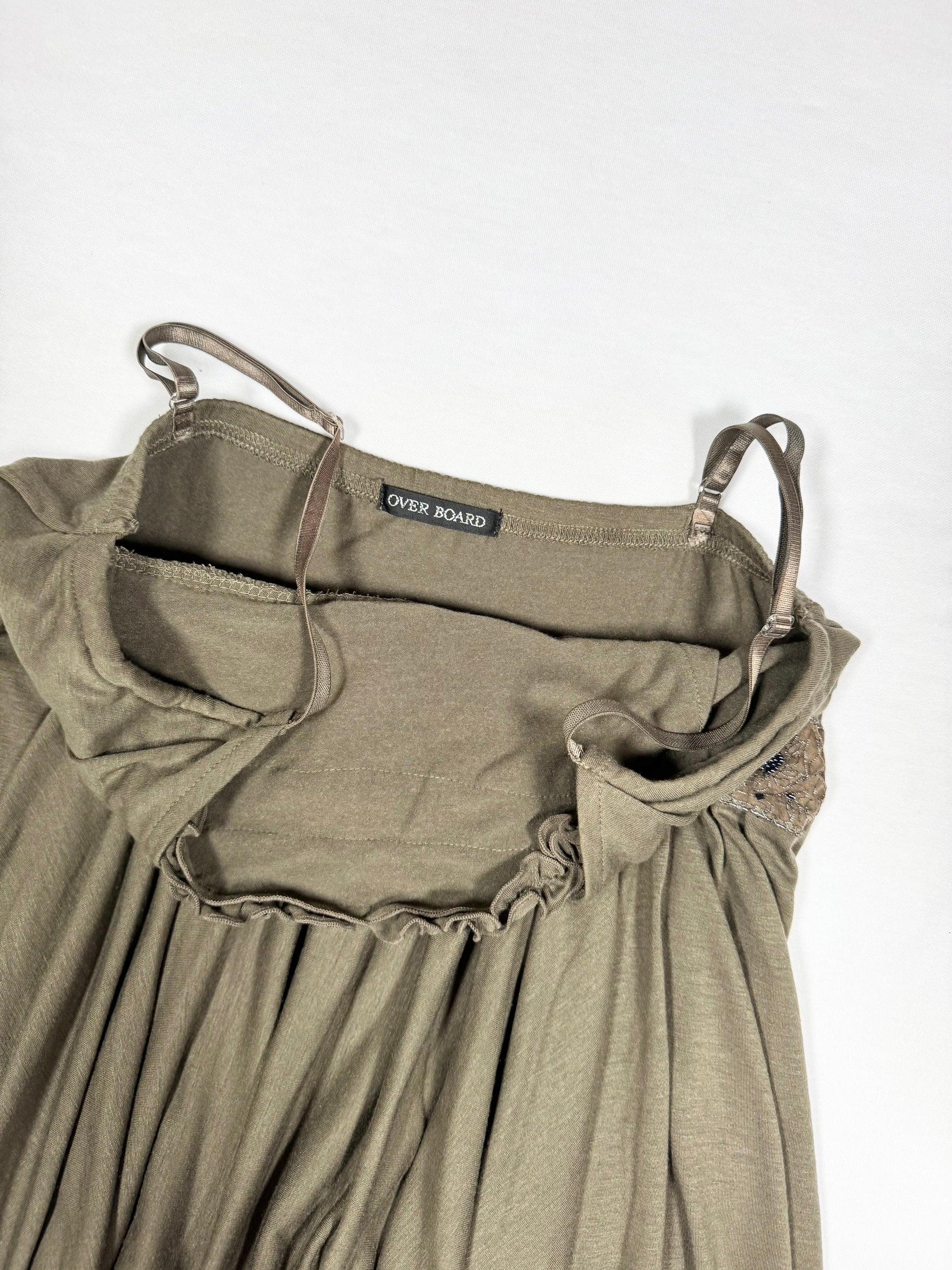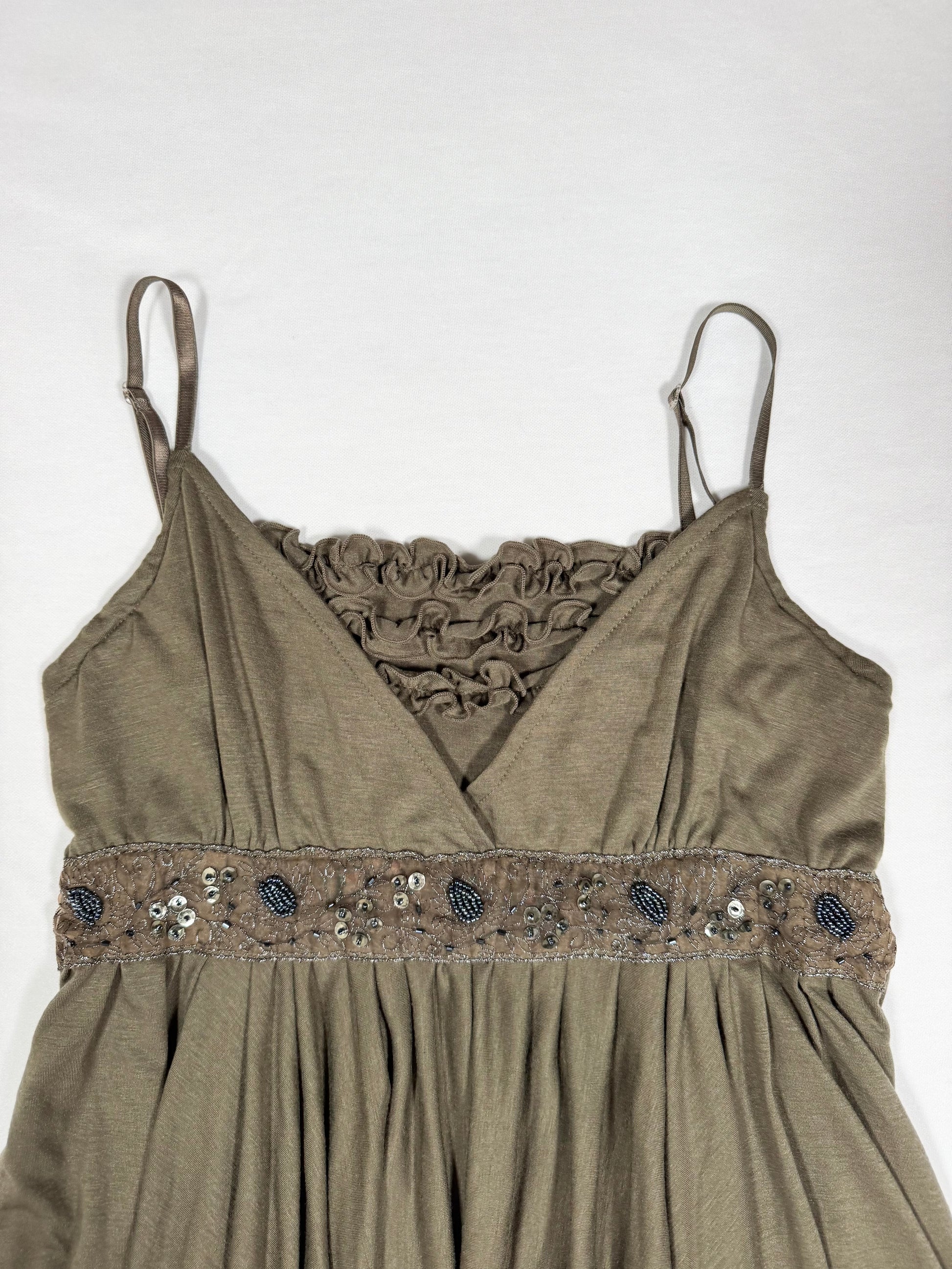 Super cute 00s “overboard” khaki cami with pixie hem🤎Ruffled bust and beaded underbust🤎