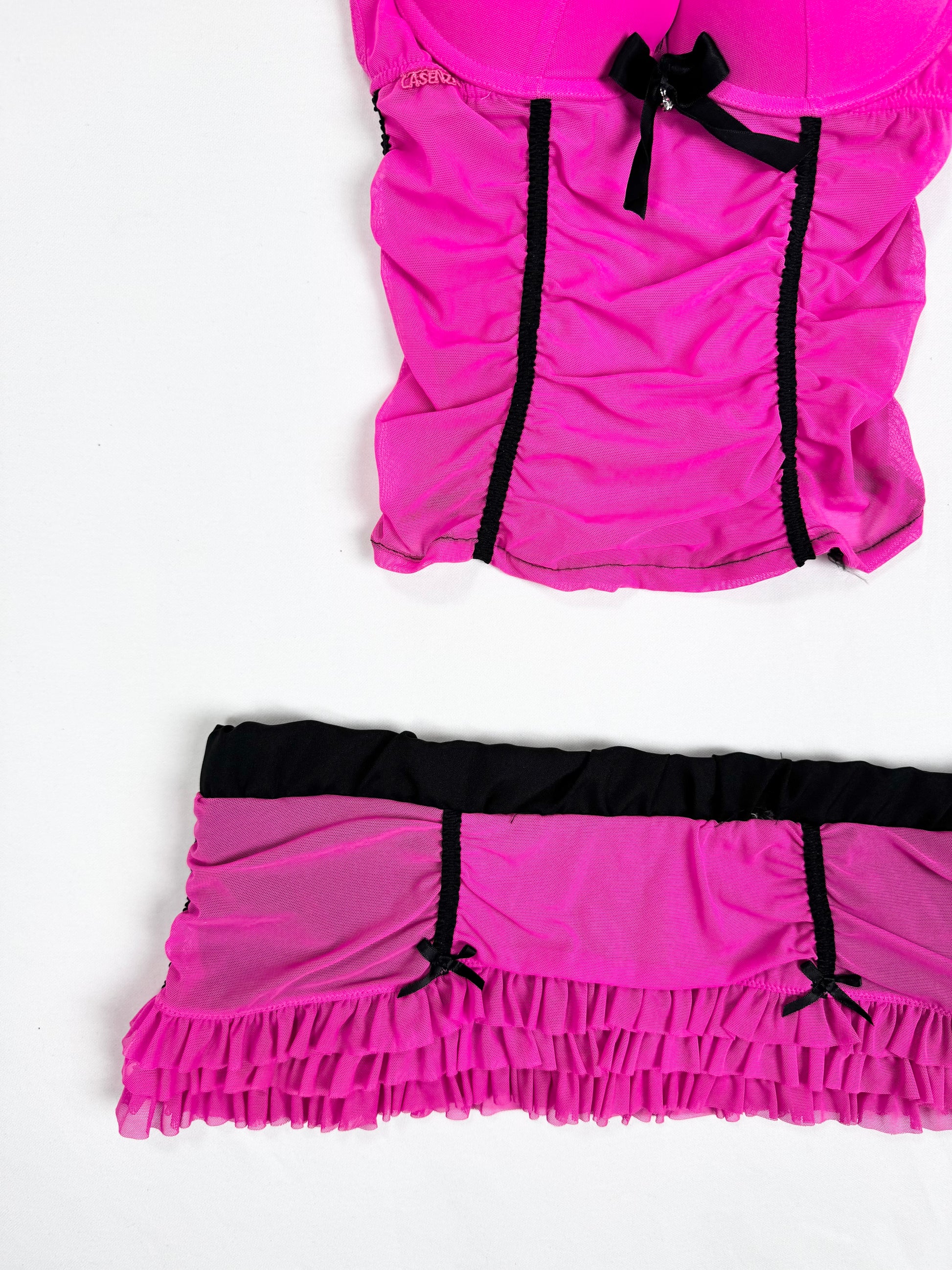 Stunning 00s la senza hot pink micromesh cami and skirt set🩷Black bow details🩷Lace up back top🩷