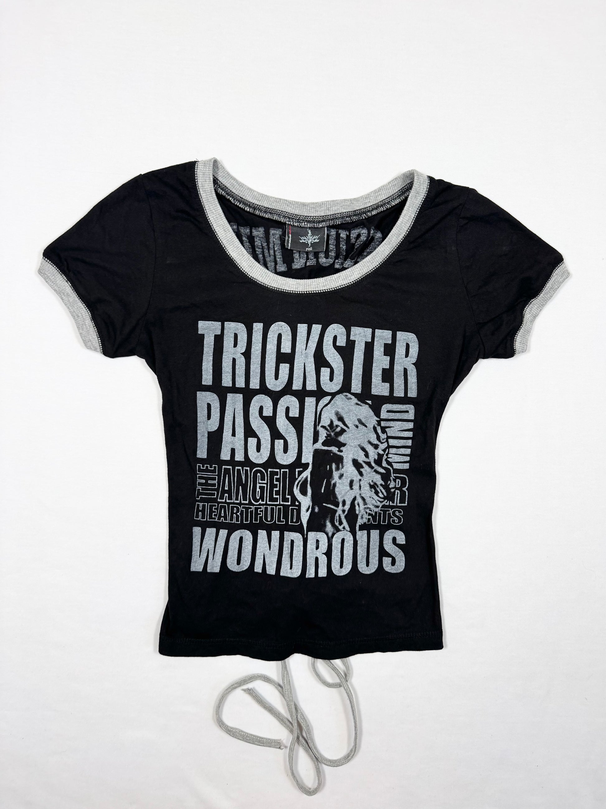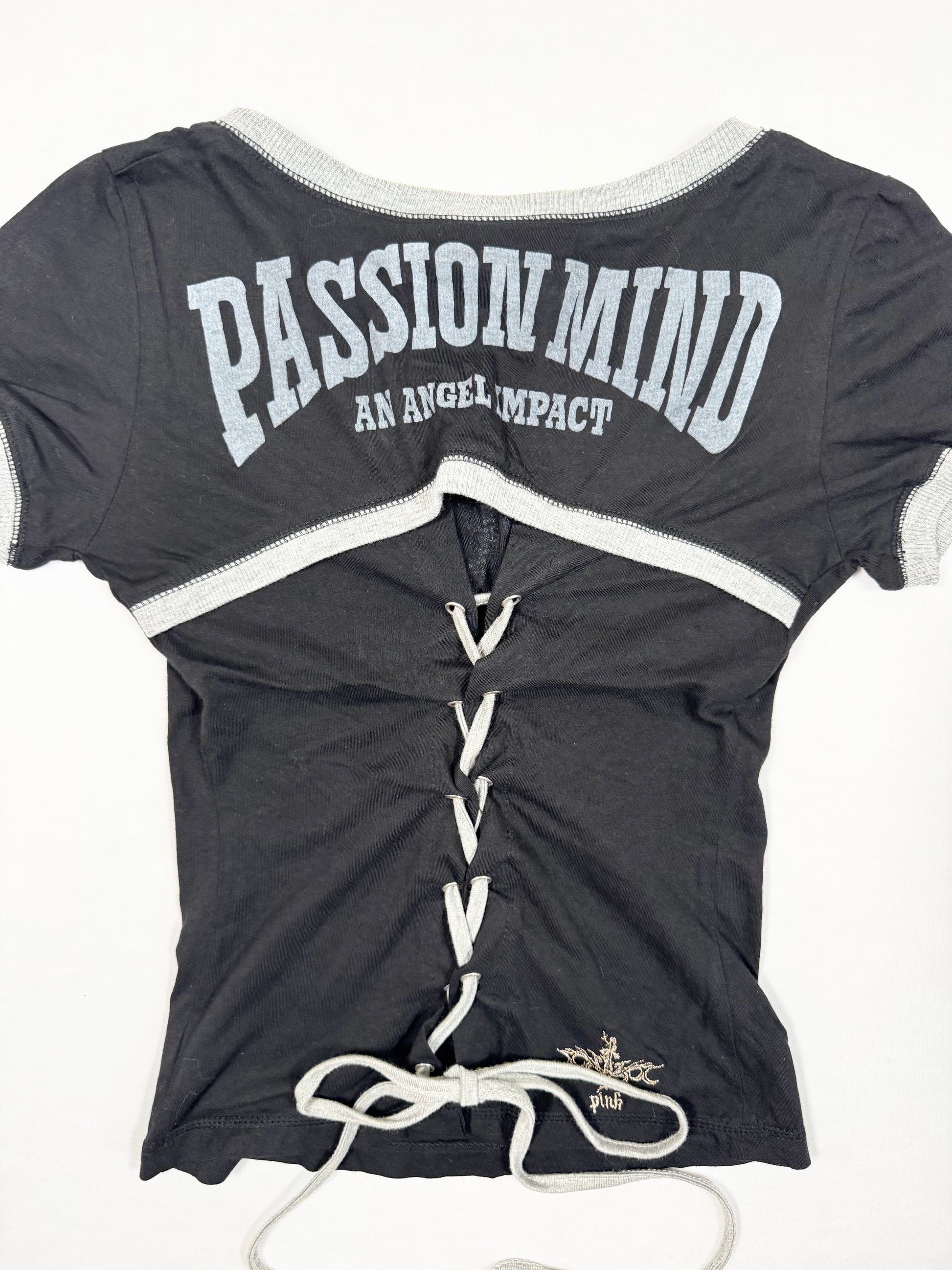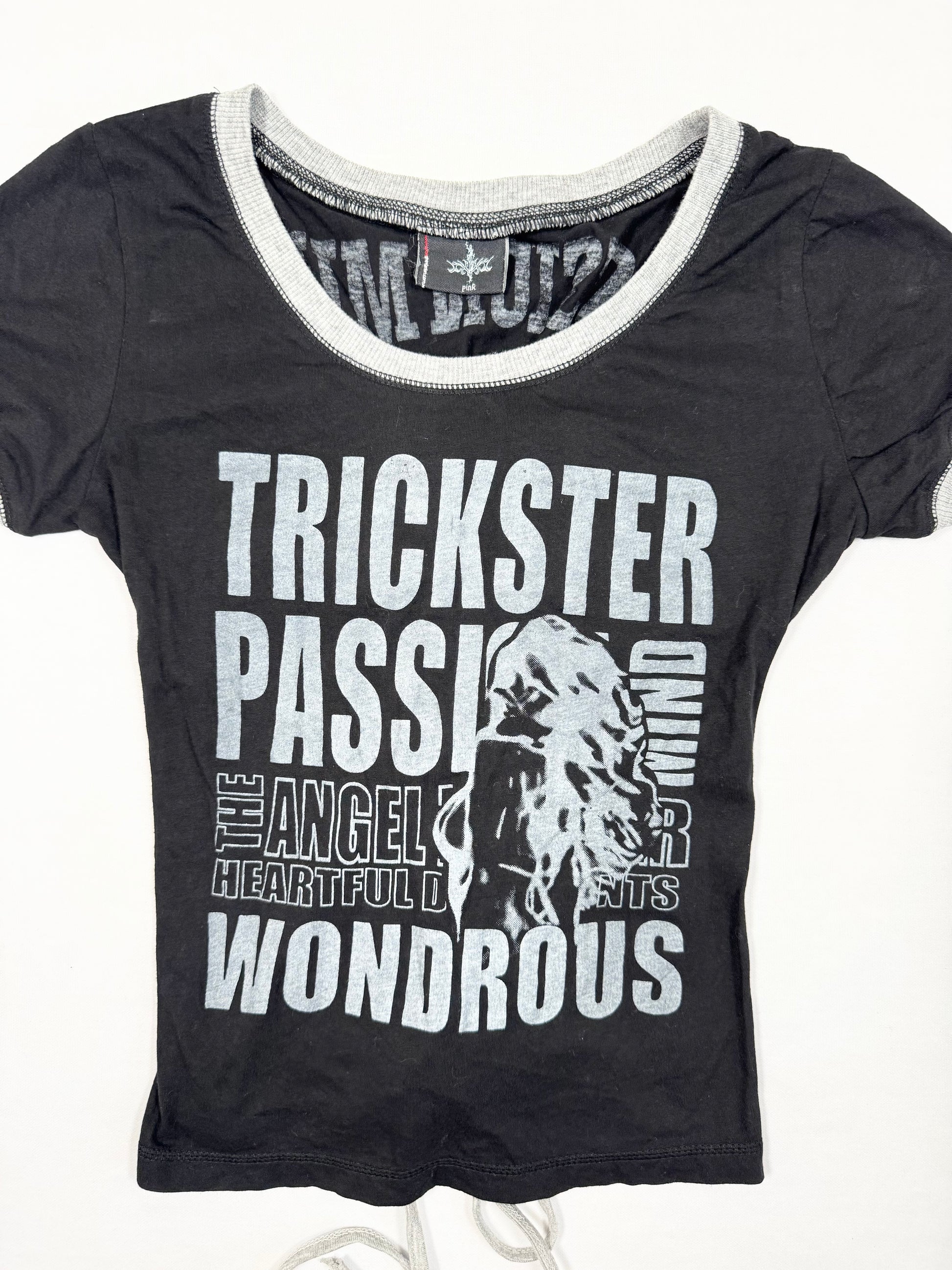 Super cute 00s grunge tee in black with grey trim and print on the front and back🖤Lace up corset back🖤