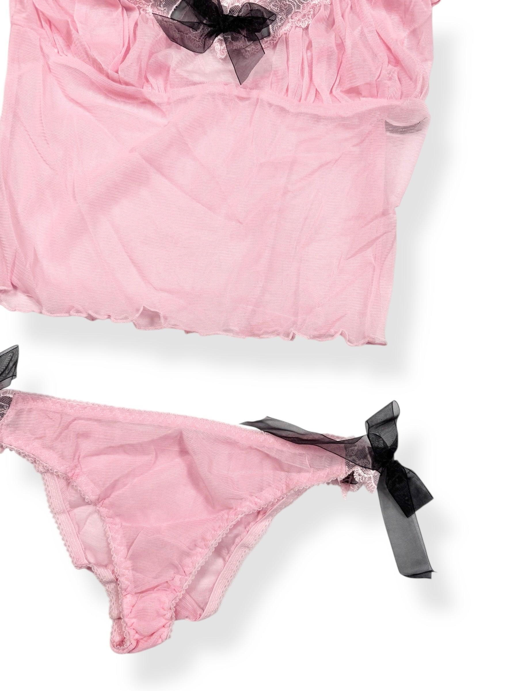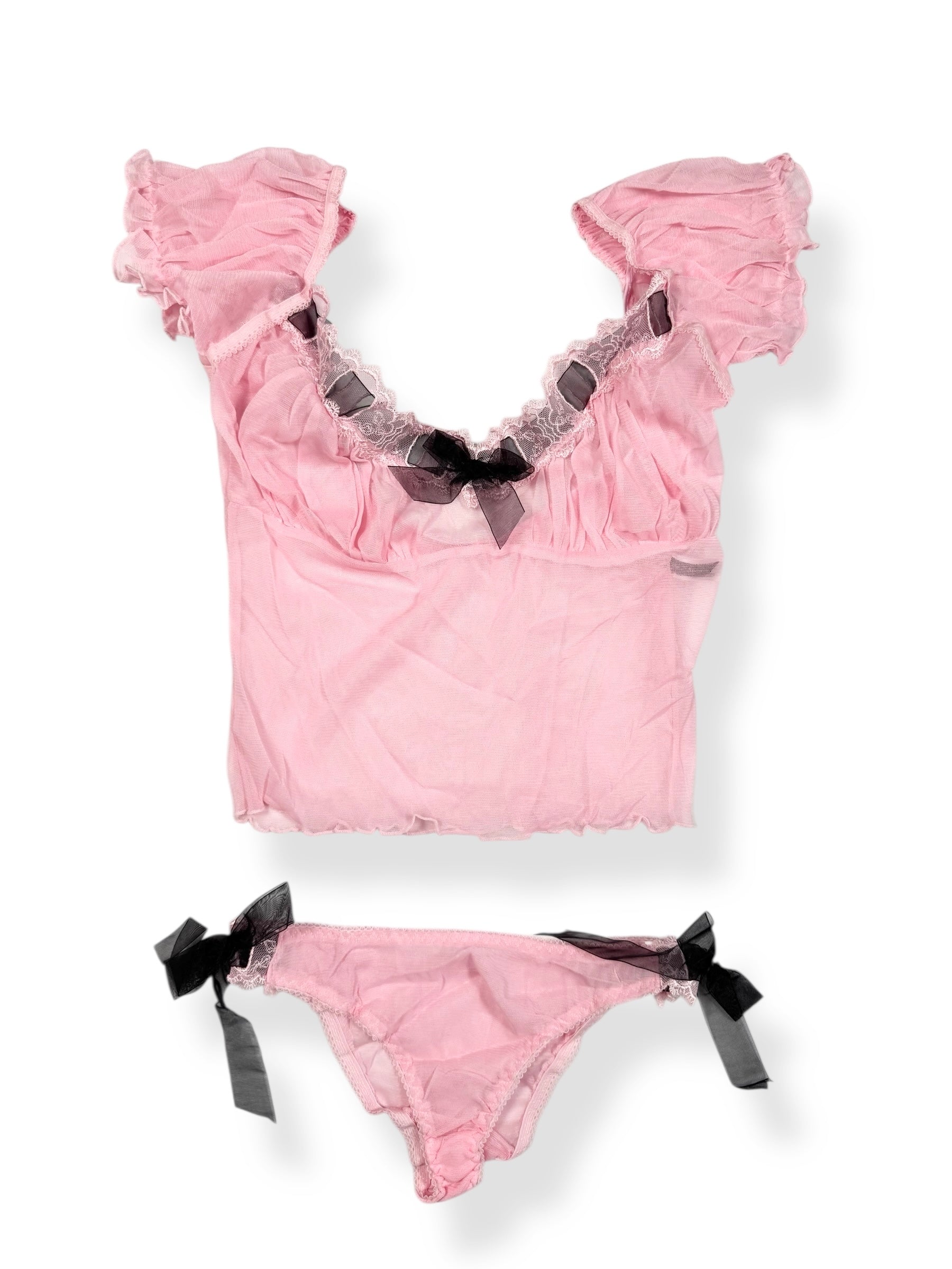 Adorable 00s brand new Deadstock leg Avenue pink micromesh milkmaid top and panties set🩷Black bow details🩷