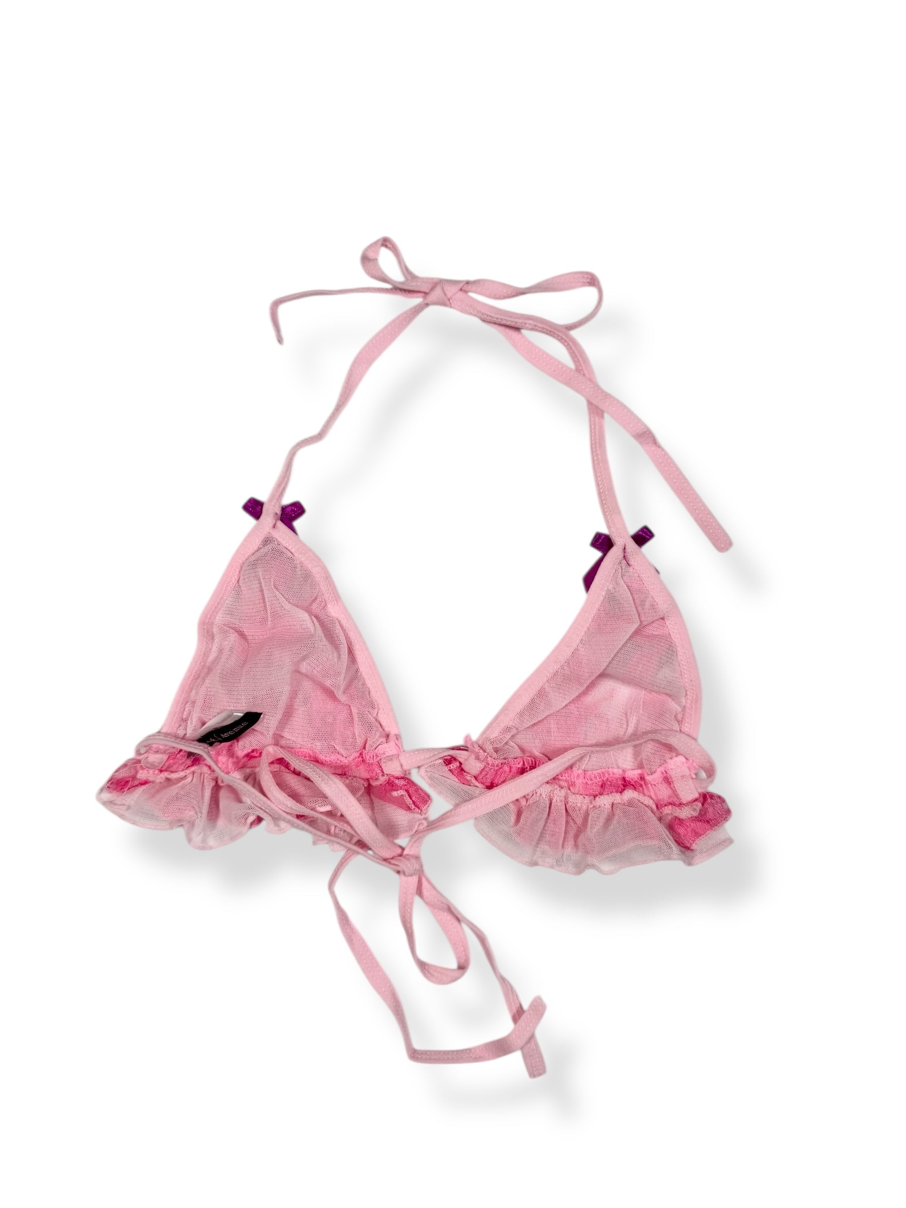 Adorable 00s Deadstock leg Avenue pink lace micro skirt and bikini top set🩷Purple bows🩷So cute for a festival!🩷
