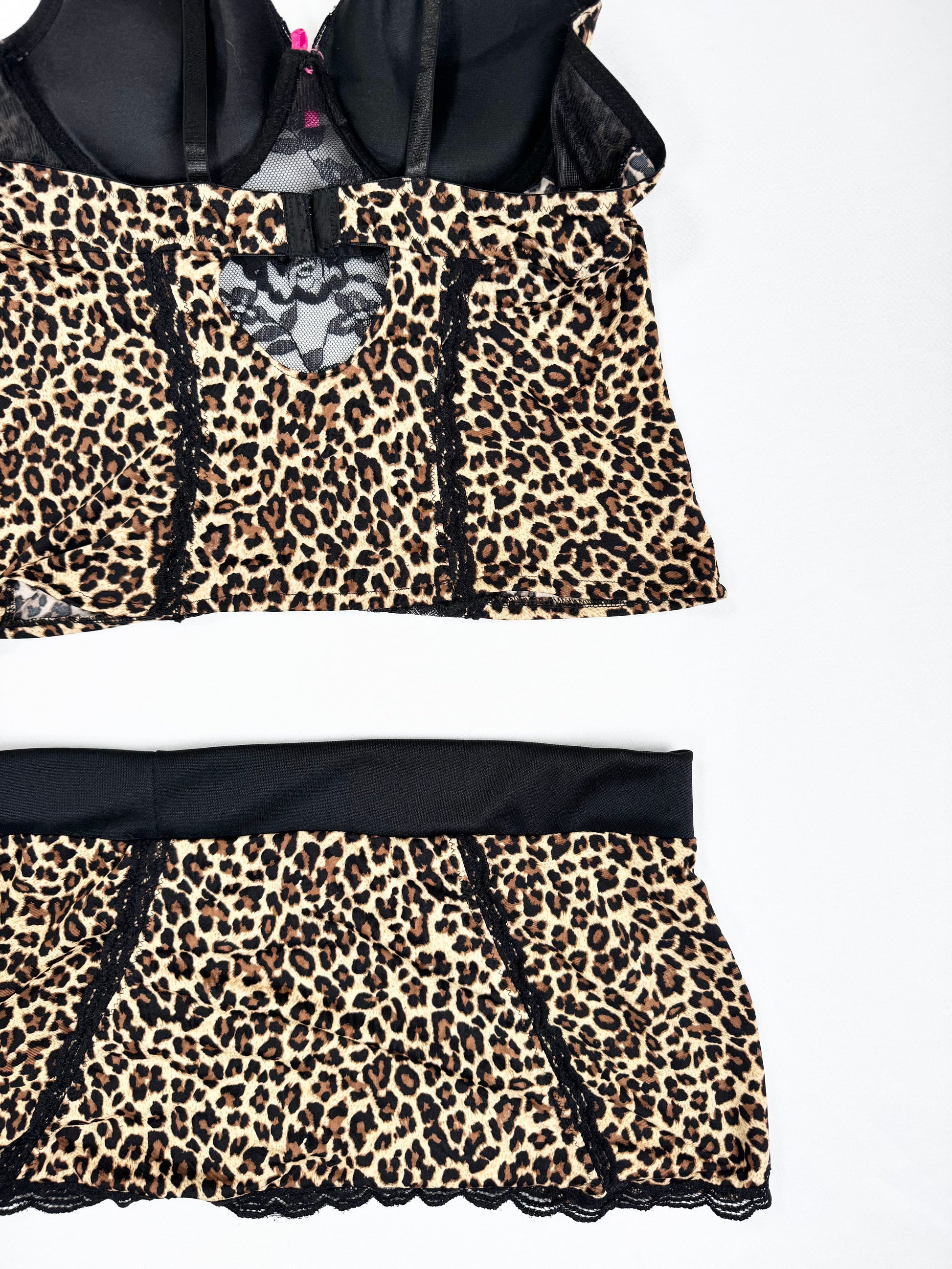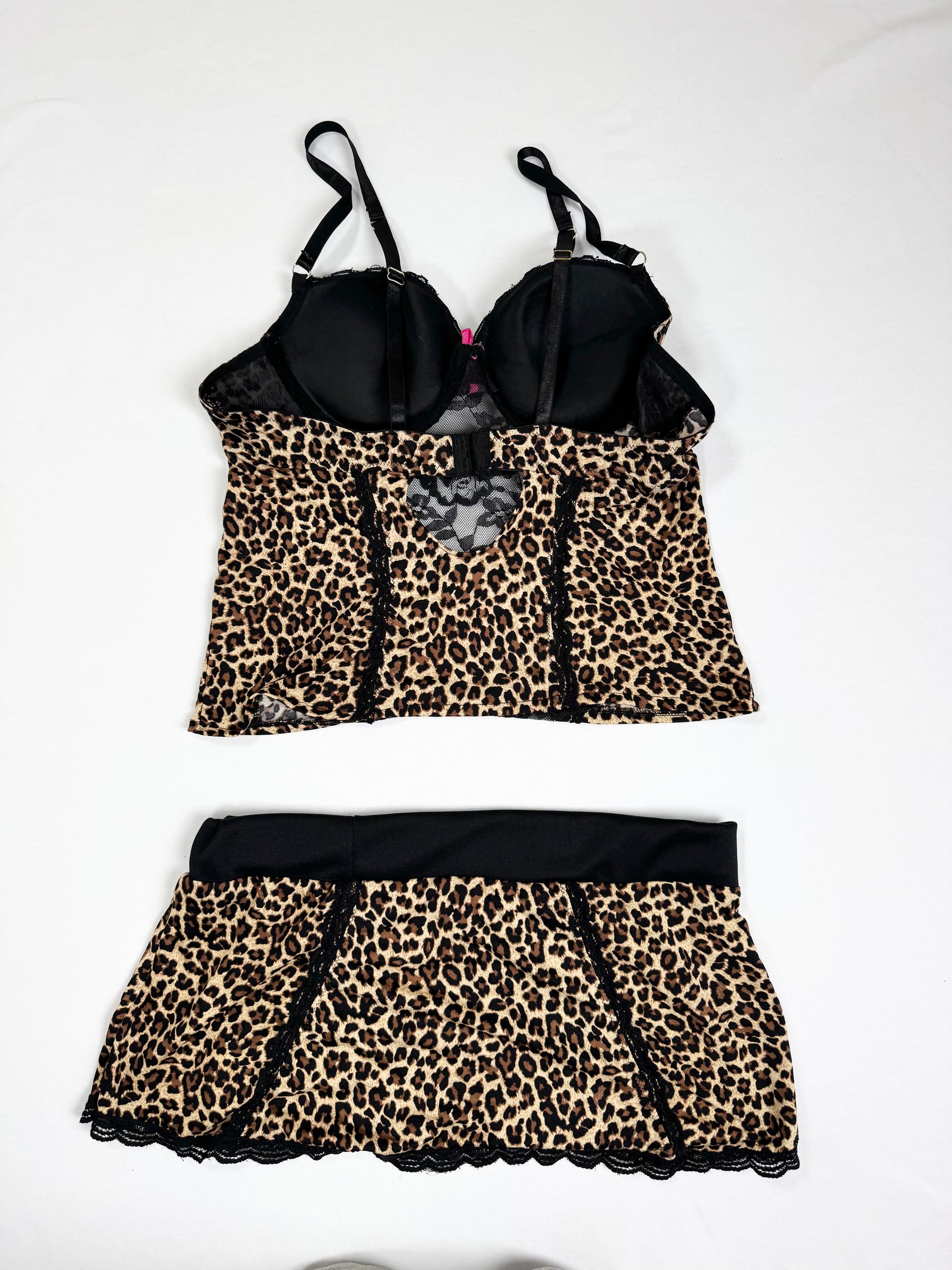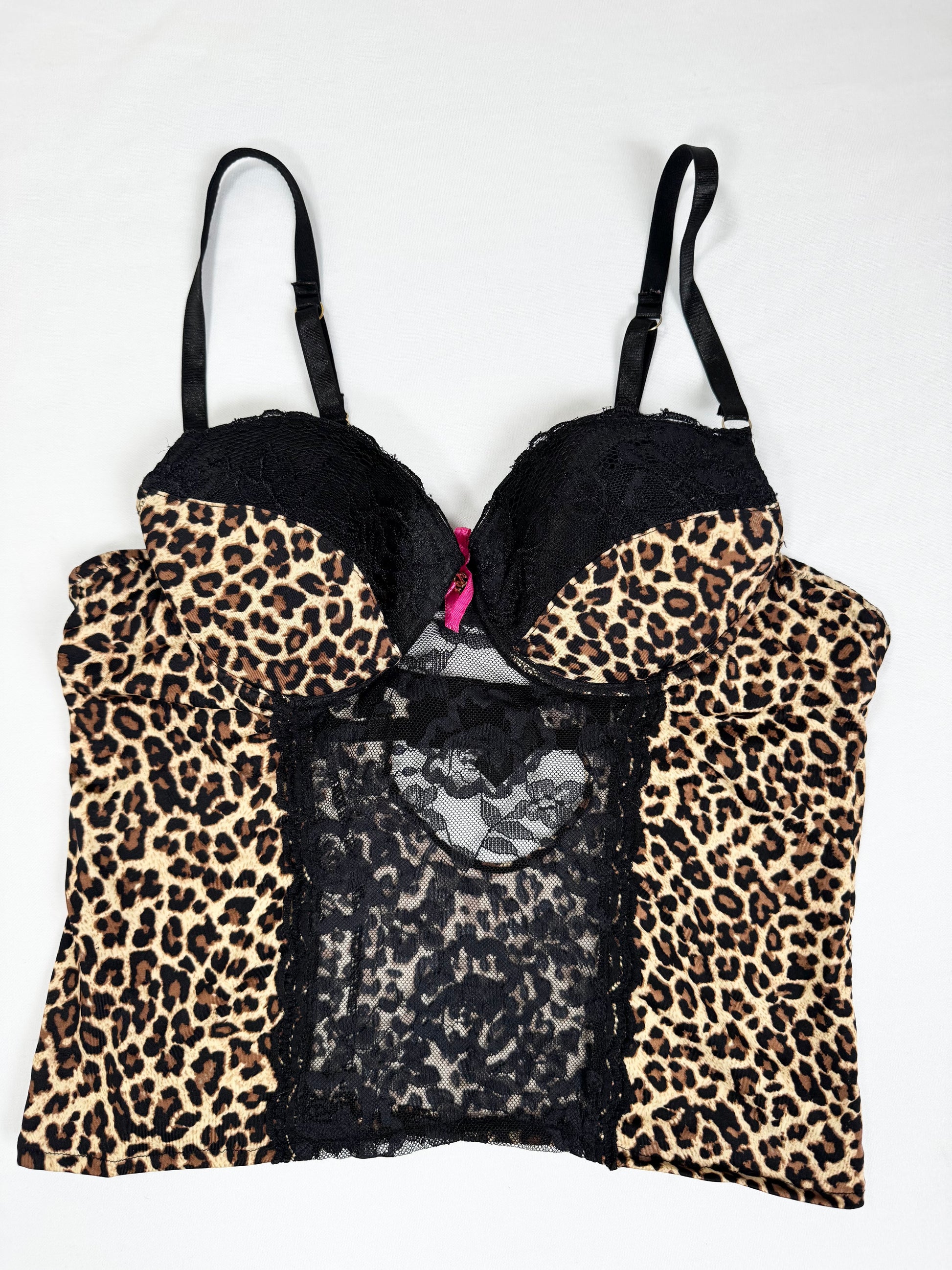 Hot 00s leopard print cami set with black lace panels🤎Pink bow in centre of bust🤎