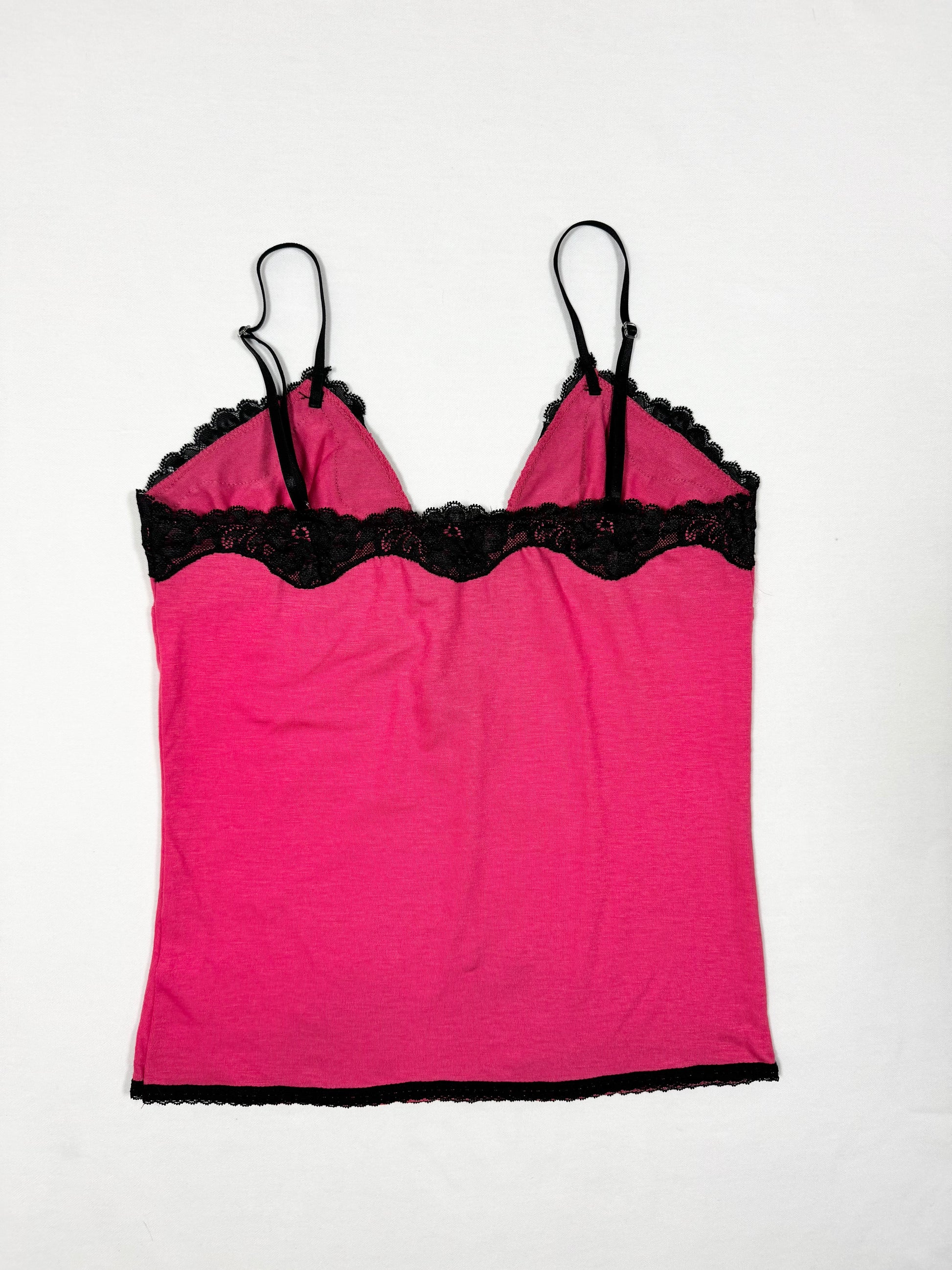 super hot 00s pink cami with black lace trim🩷Leopard and Diamante metal hardware centre of bust🩷