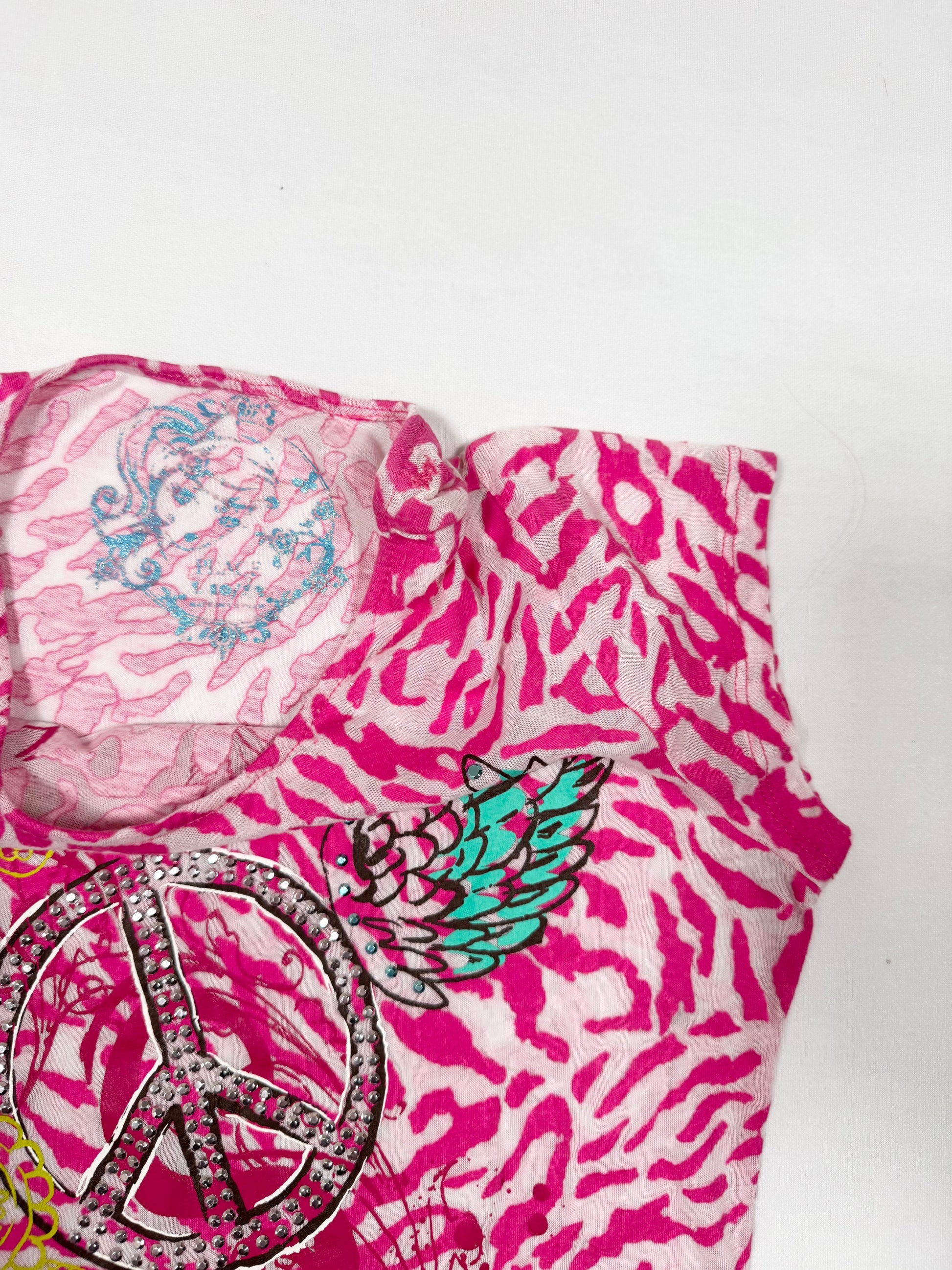 Cutest 00s MCBLING tee in pink leopard print with Diamante peace print design on the front🩷