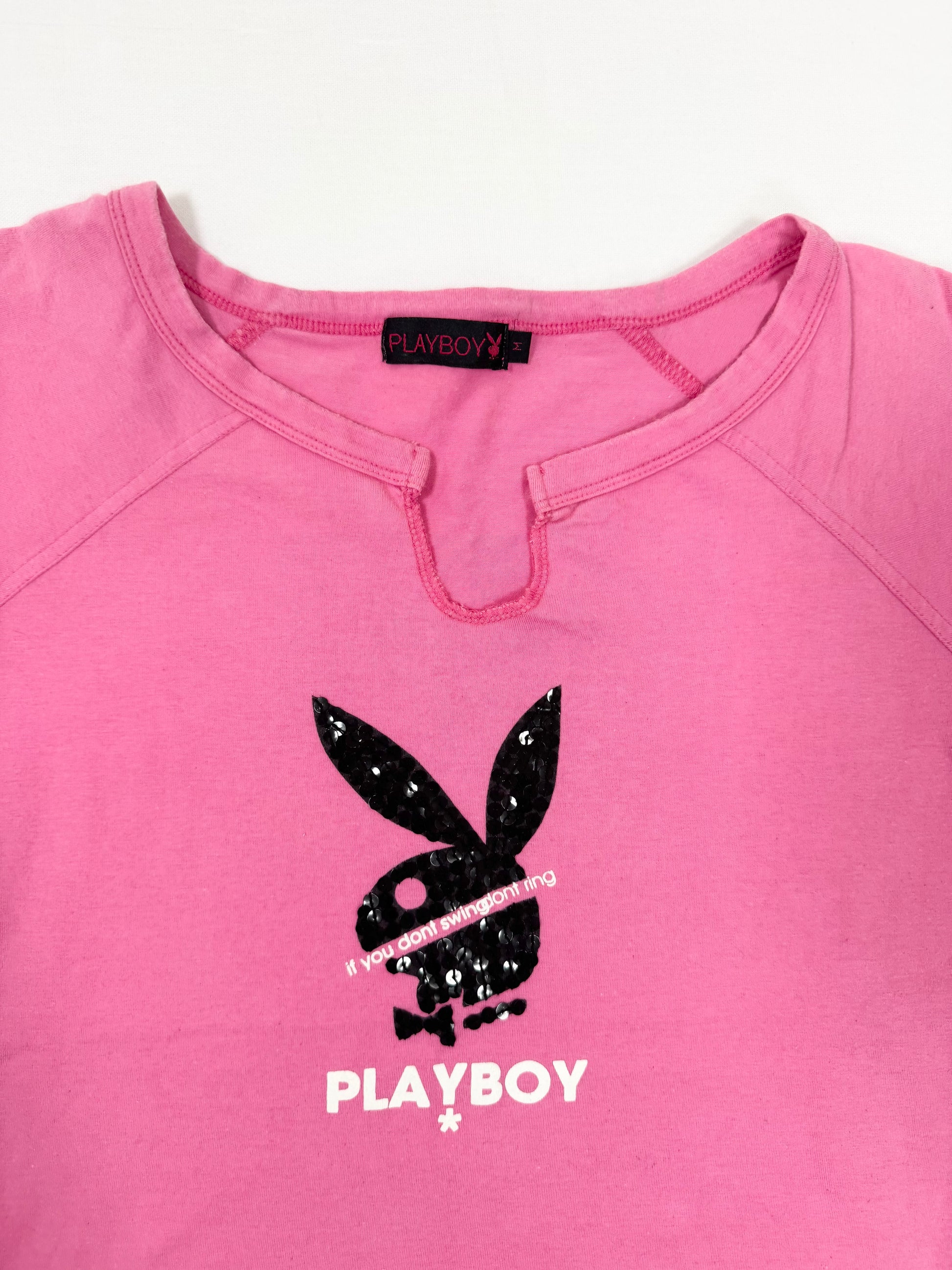 Super cute 00s pink playboy tee with black sequin bunny on the front💗”if you don’t swing don’t ring” print💗
