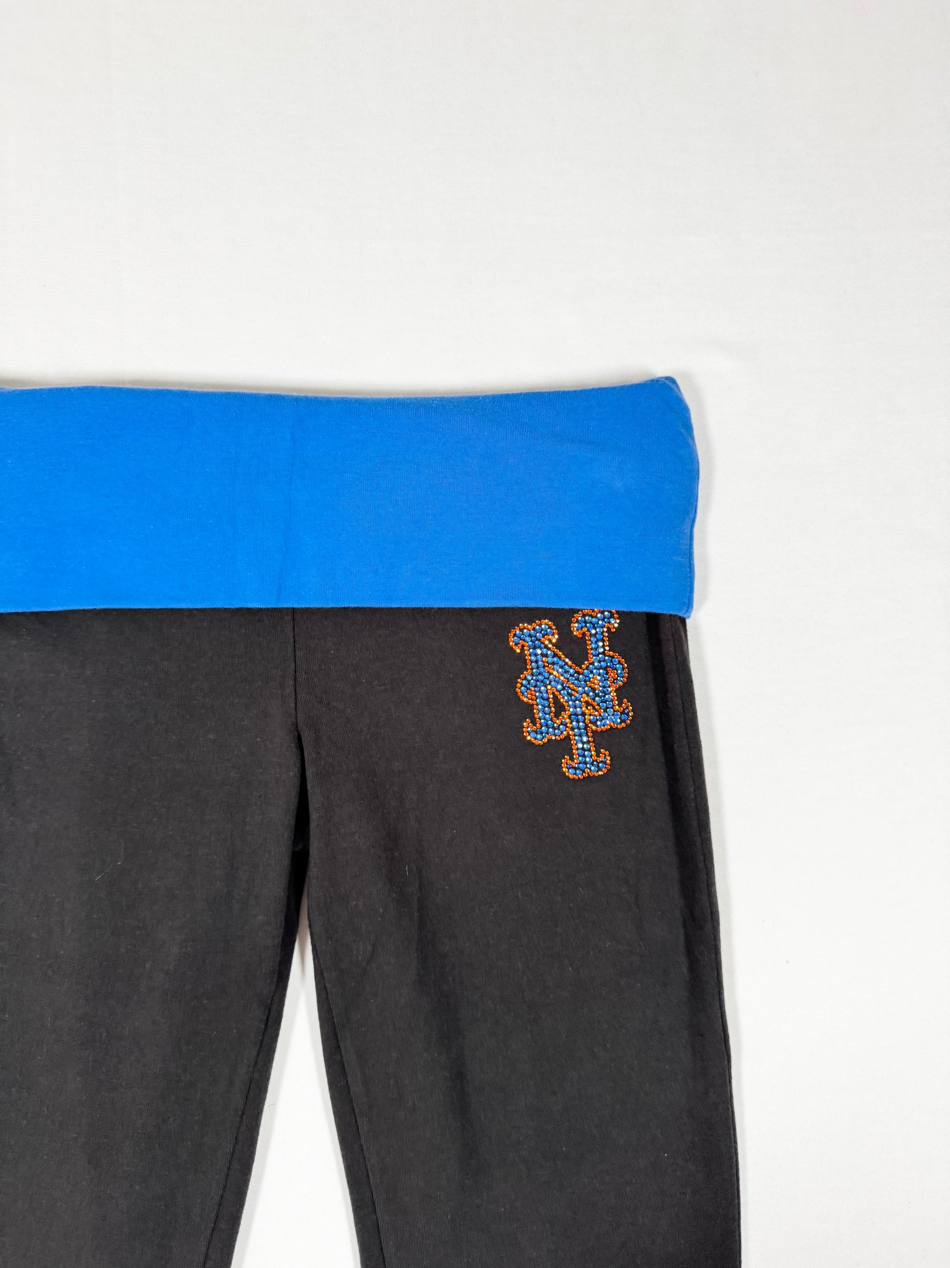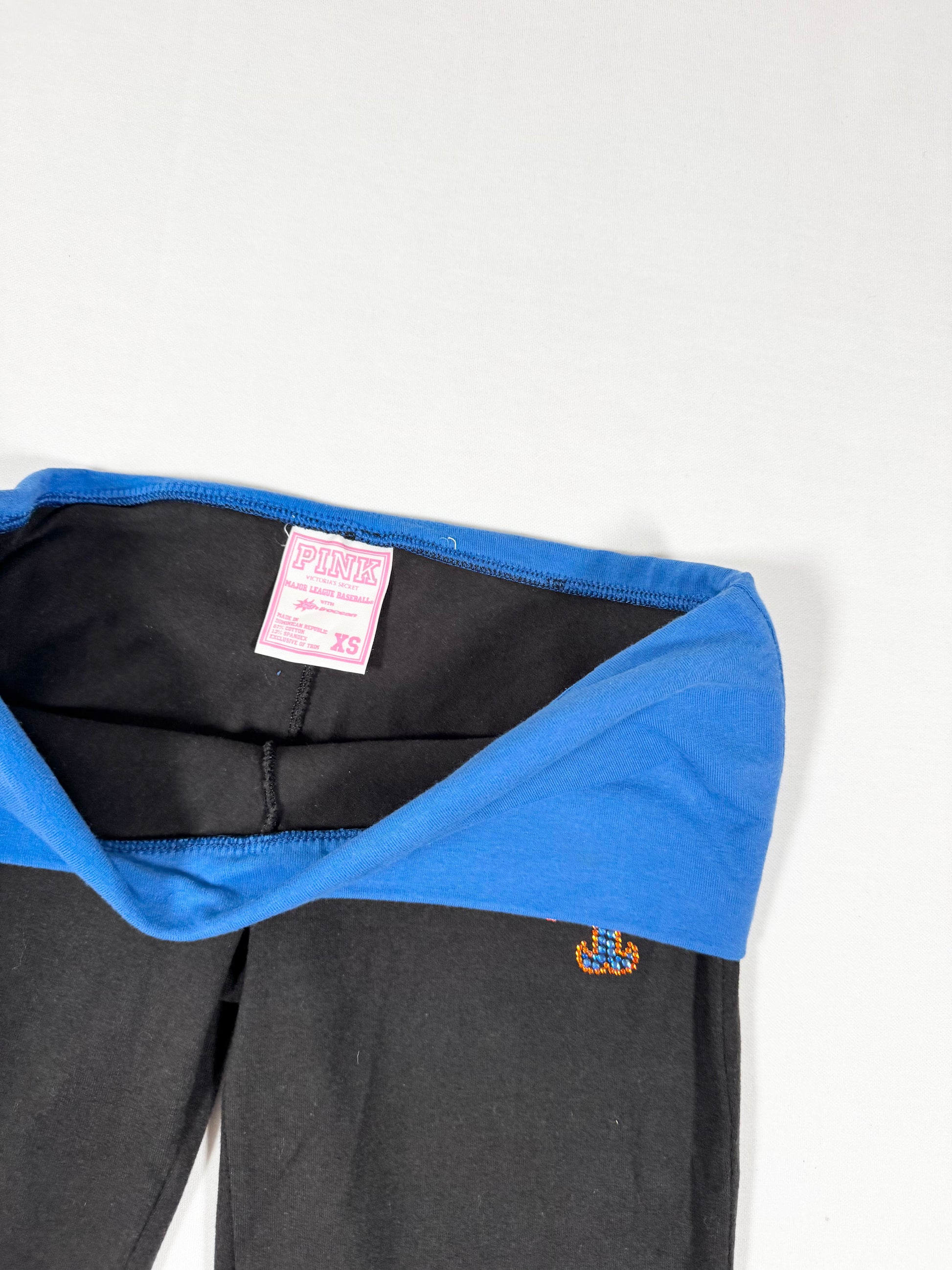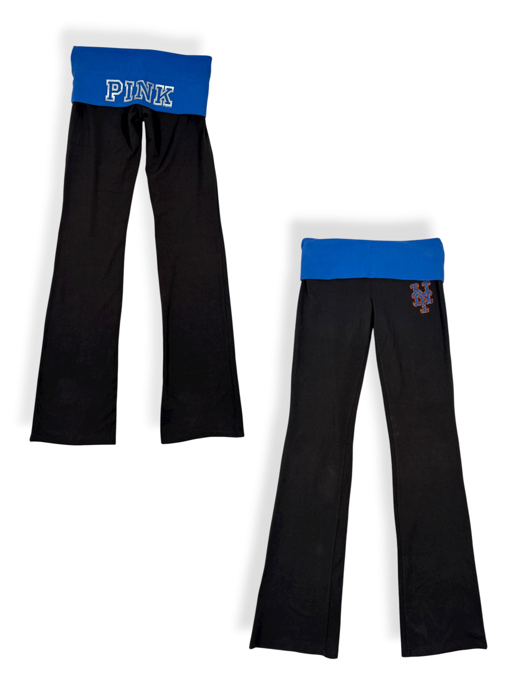 Iconic 00s PINK by Victoria’s Secret low rise fold over waistband flared leggings🖤Black with blue waistband with silver logo on the back🖤Diamanté mets design on the front🖤
