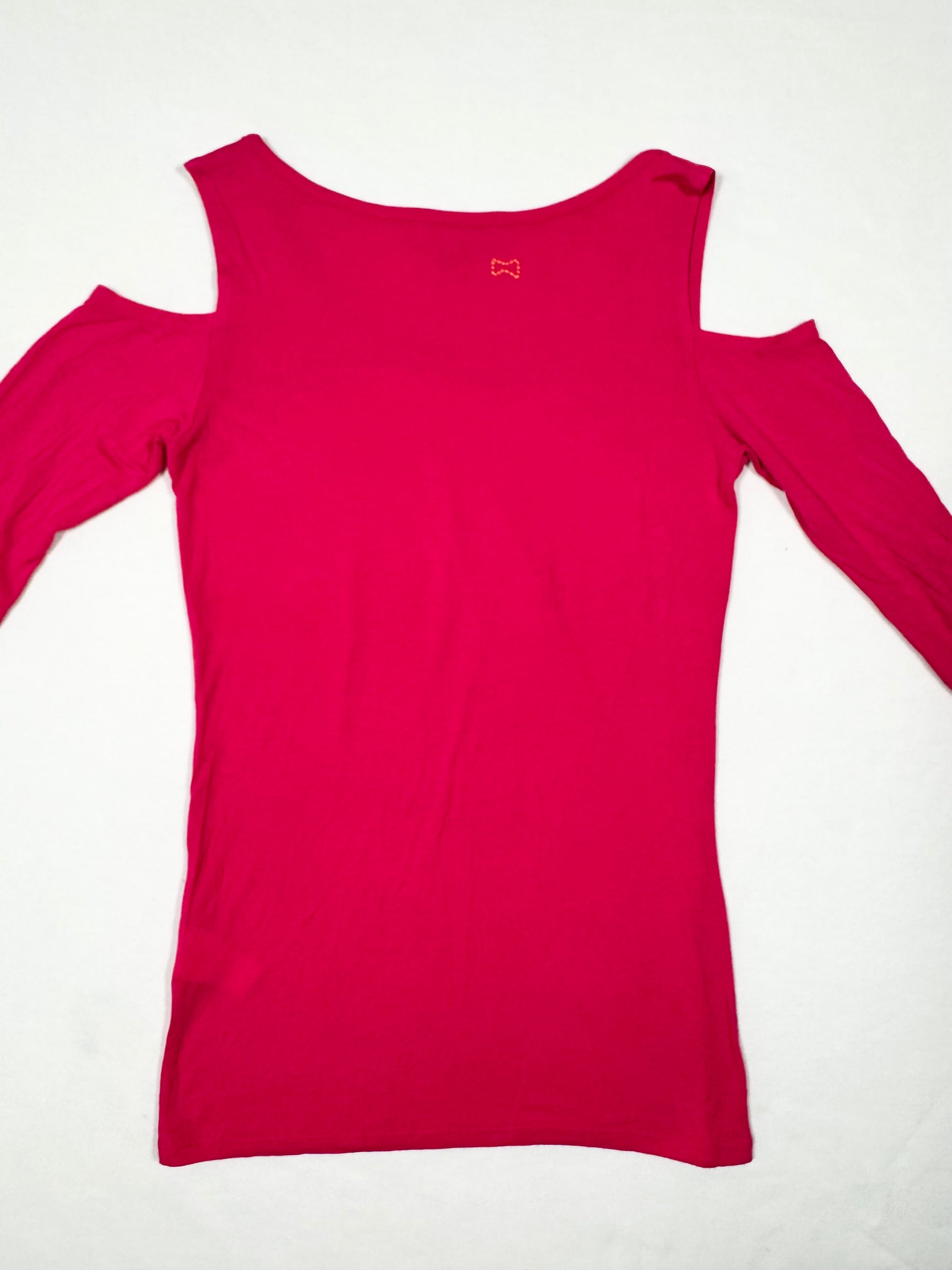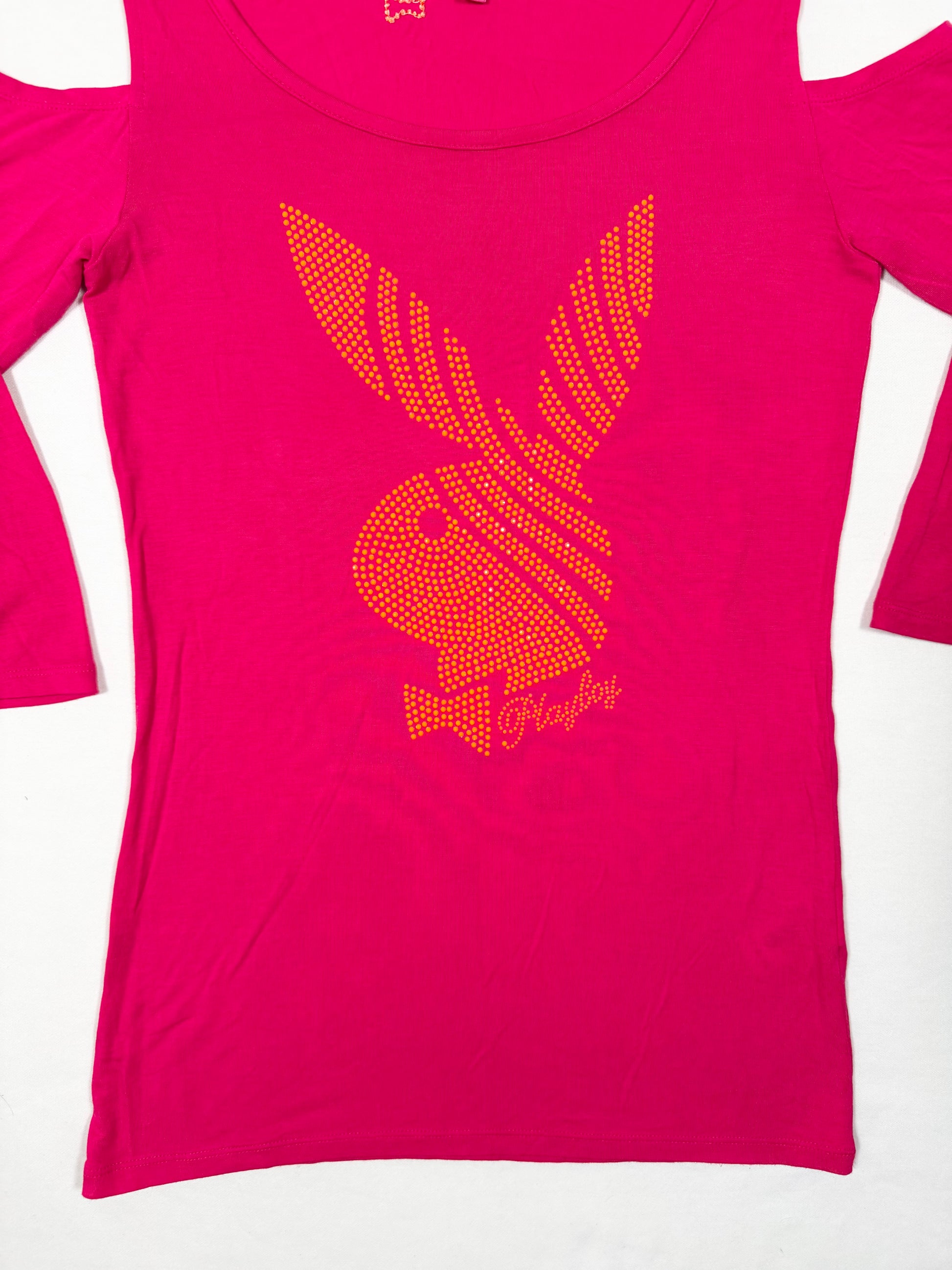 Hot 00s pink playboy 3/4 sleeve top with cut out shoulders and playboy logo in orange on the front🩷