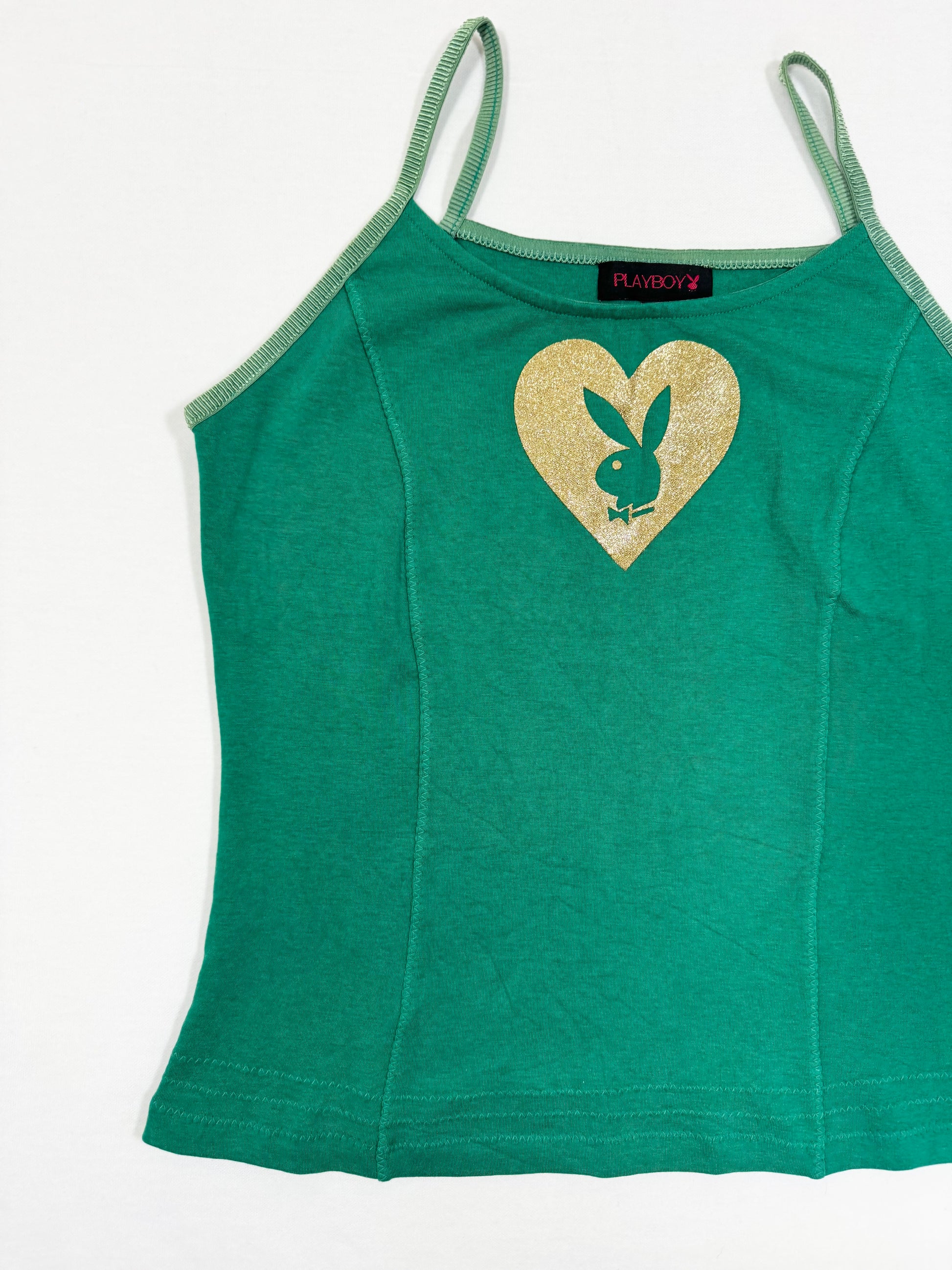 Cute 00s green playboy cami with glittery heart logo print on the front🤍