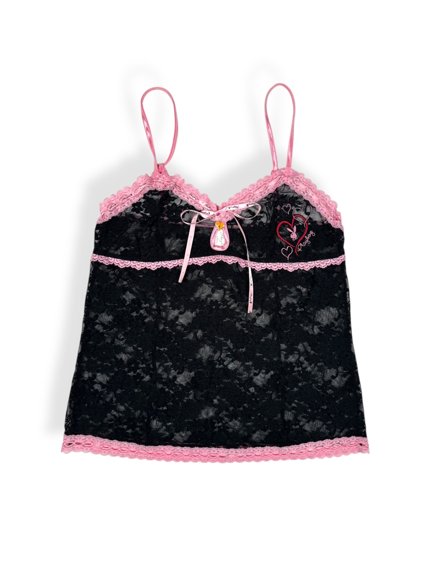 RARE 00s playboy cami🩷Literally the prettiest I have ever seen🩷Black lace with pink lace trim🩷Logo pink satin ribbon tie centre🩷Keyhole with logo heart charm🩷Embroidered hearts and bunny logo on the bust🩷