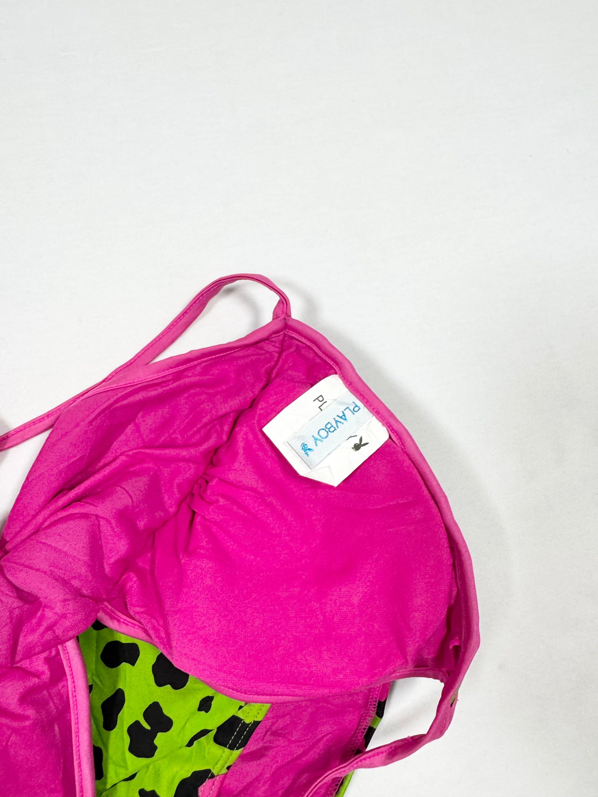 Insane 00s rare playboy green and pink leopard print swimsuit🩷Glittery pink bunny on the bust🩷Open back with halter neck tie and back tie🩷