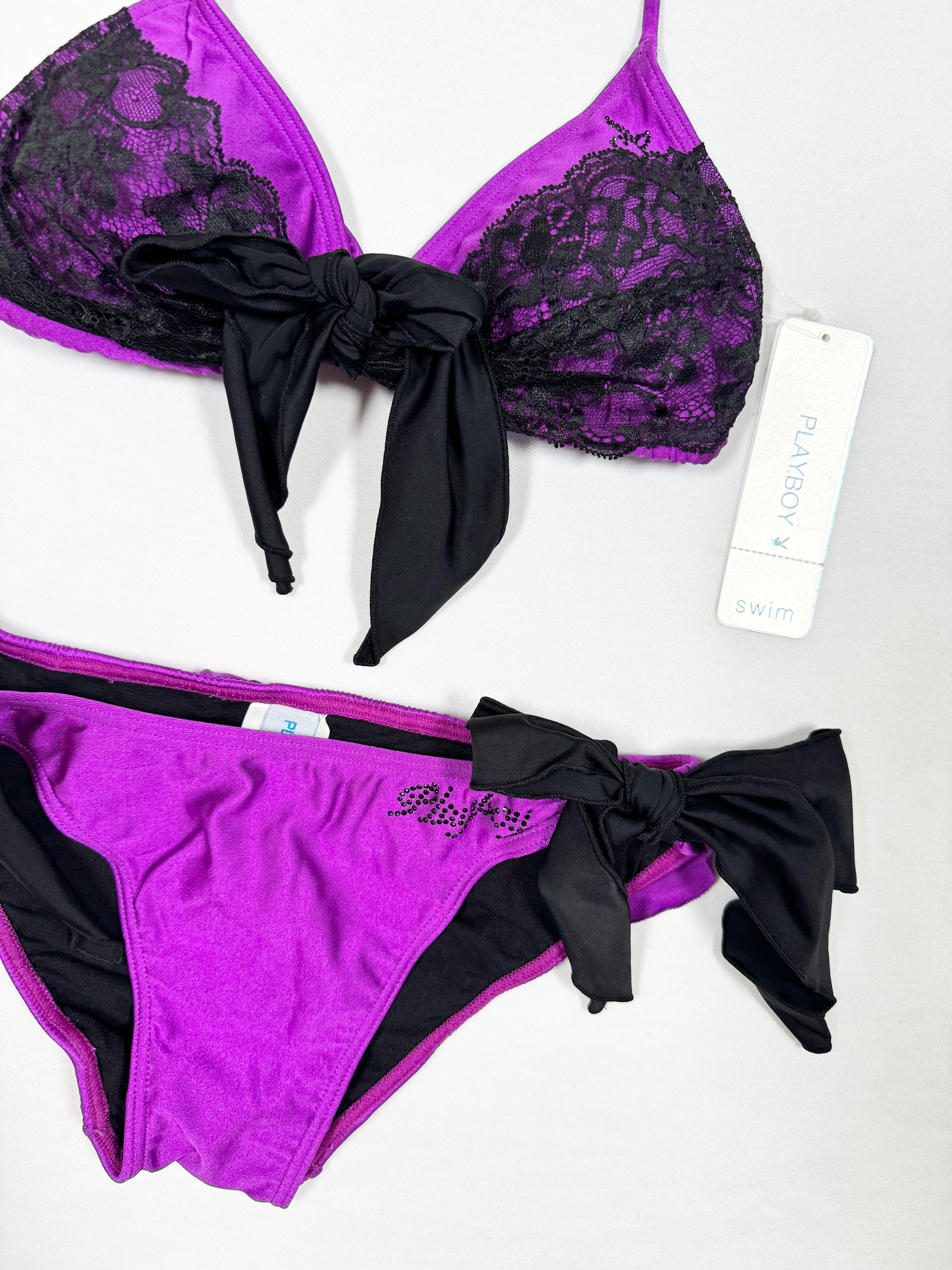 Adorable 00s brand new with tags playboy bikini in purple💜Black lace bust details💜Black bows💜Black Diamante logo bunny and Spellout💜Cute ruffles on the back💜