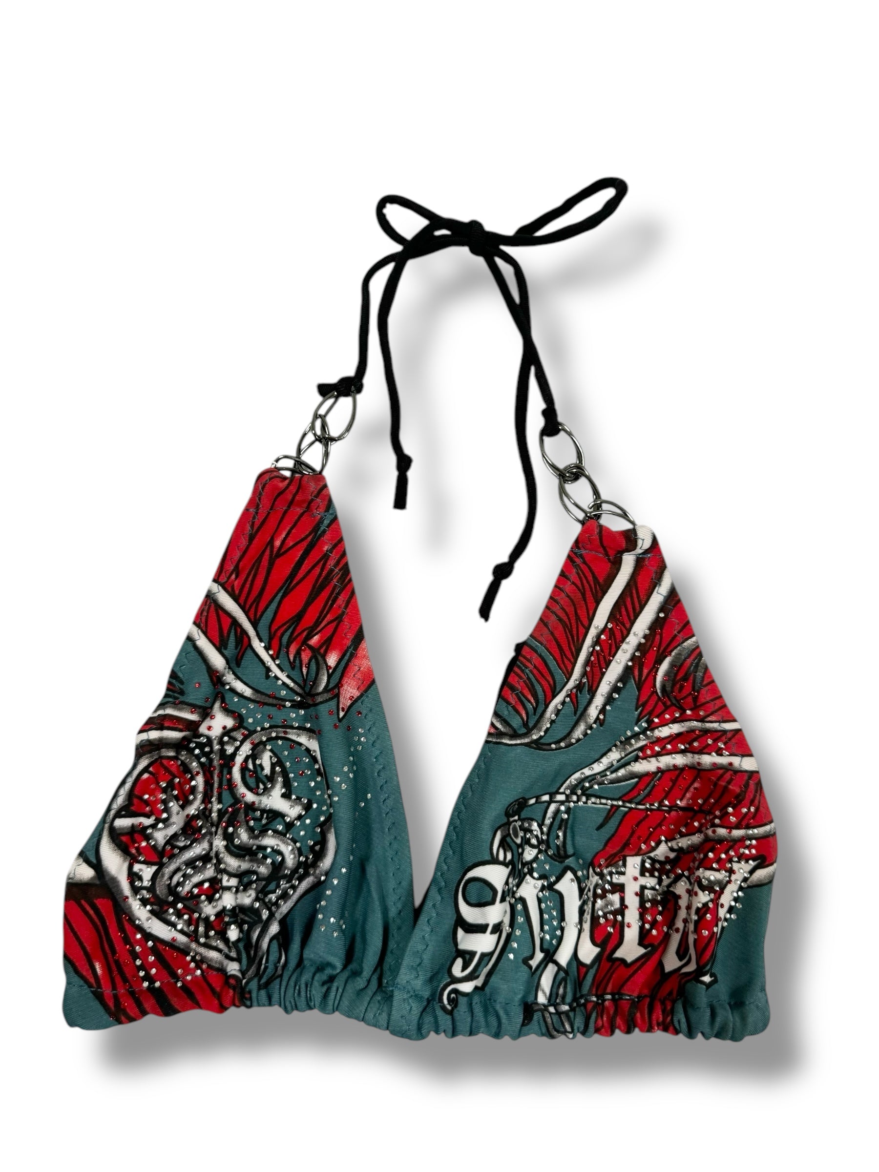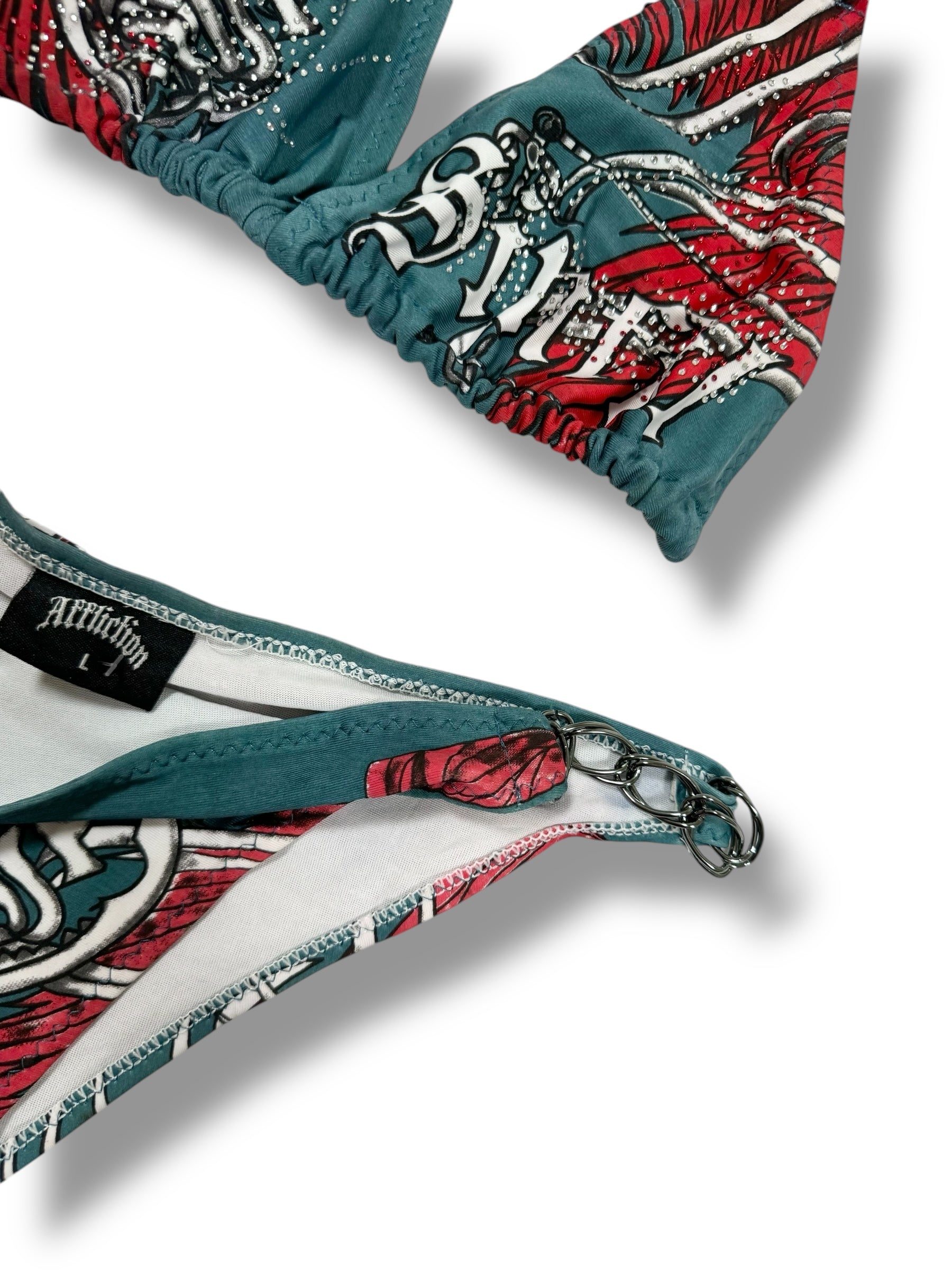 00s sinful bikini in green and red logo print design with diamantés and chain straps🤍