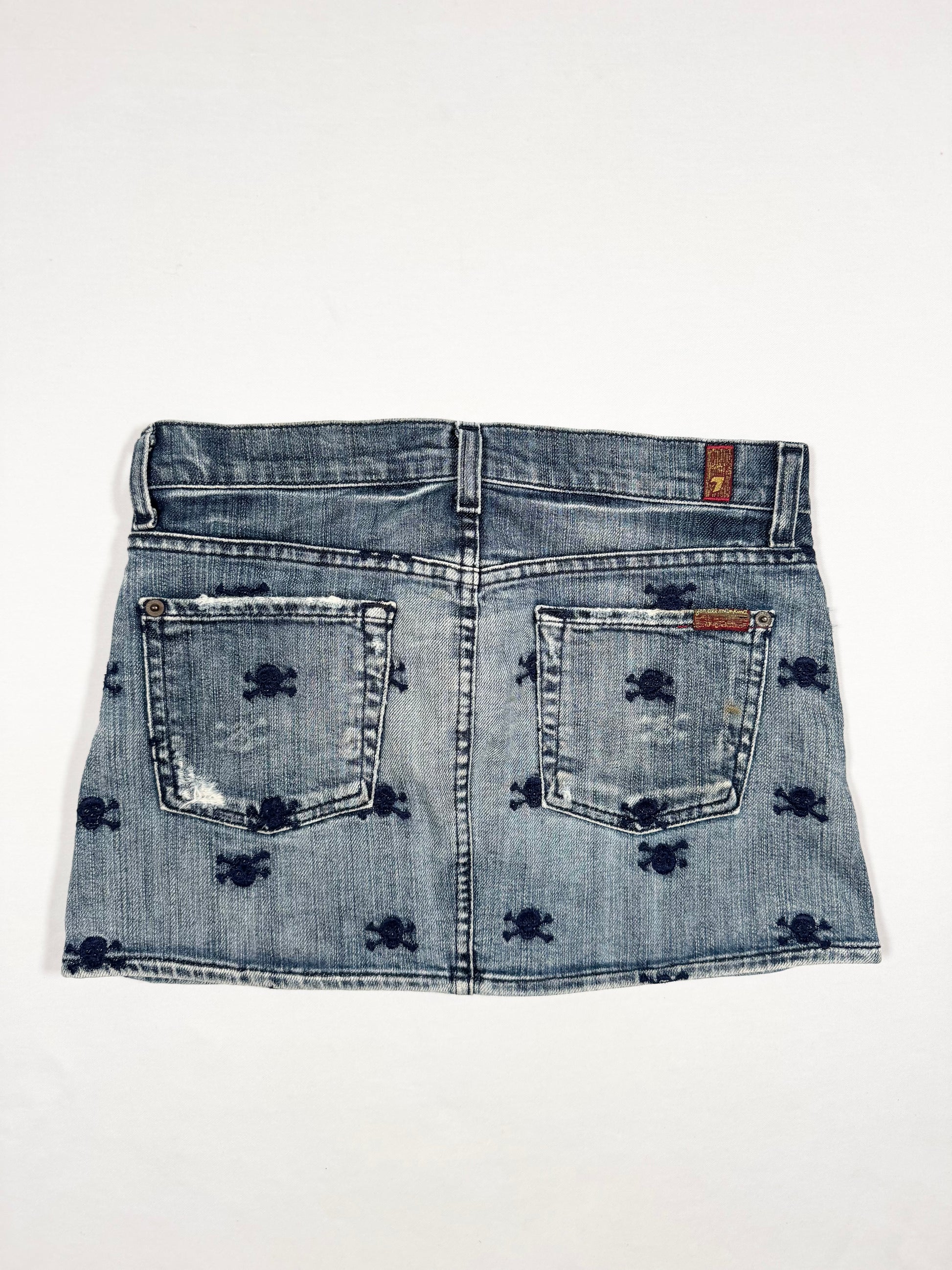 Cutest 00s low rise denim mini skirt with embroidered skulls all over🖤