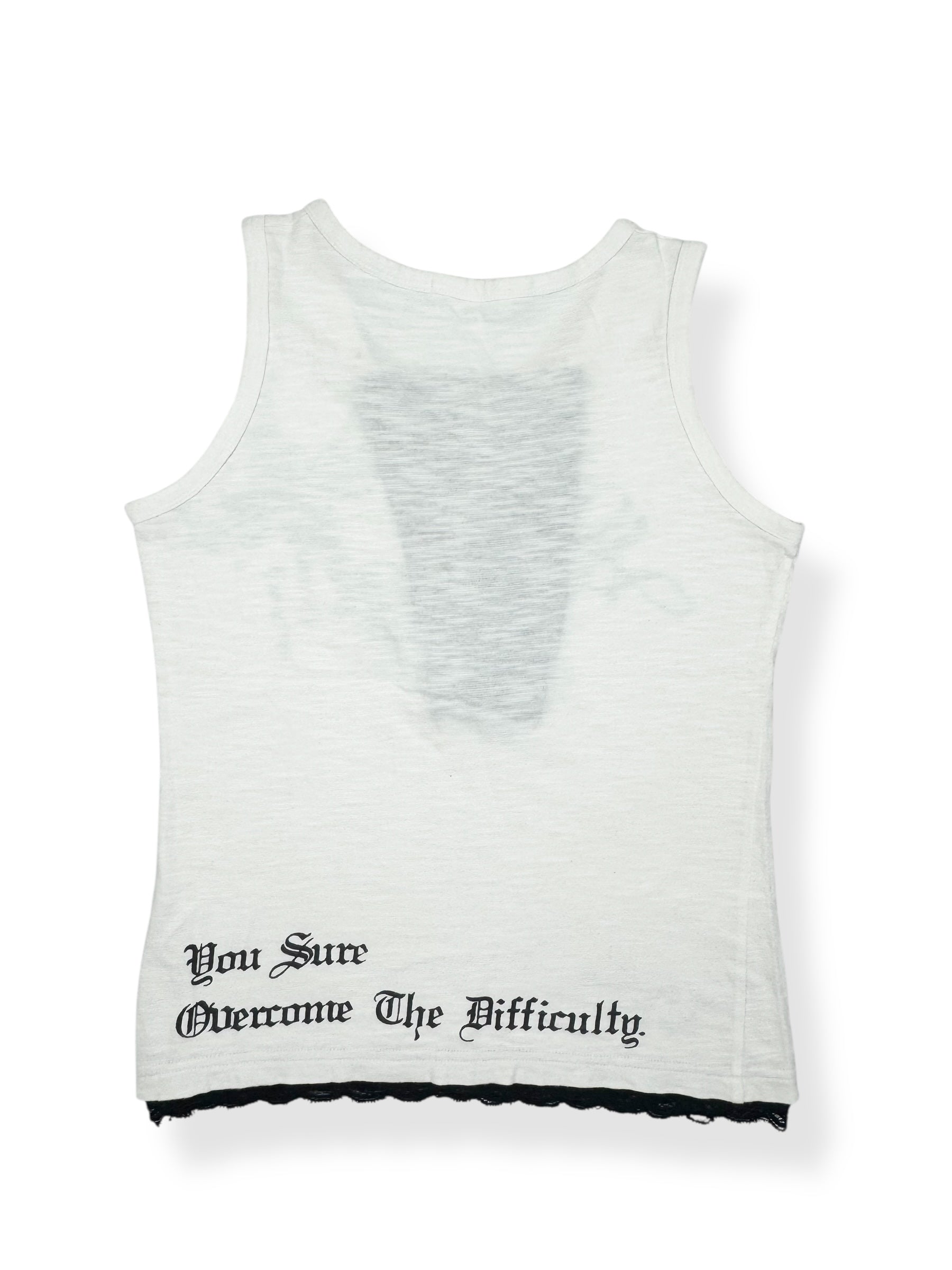 Cute 00s grunge tank in white with black cross and “strength” print🖤Balck lace bust and trim🖤Cute button details🖤