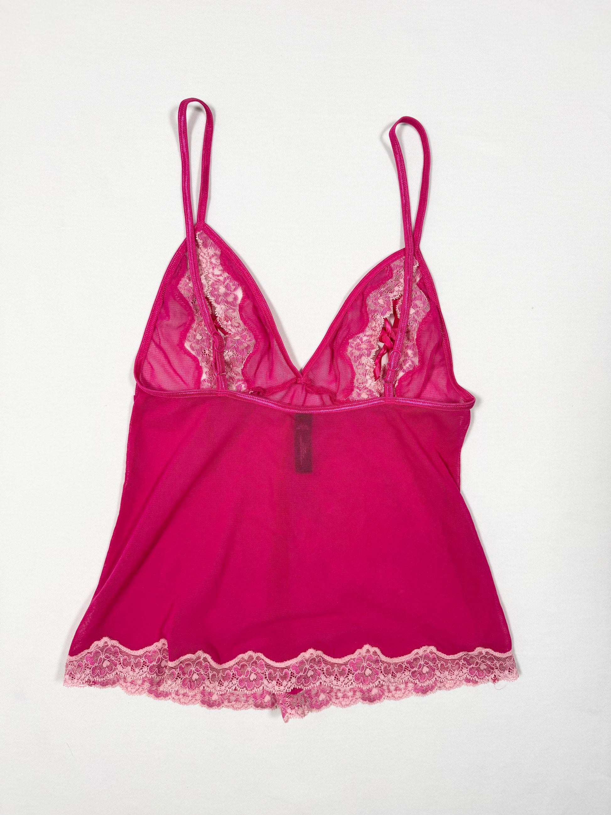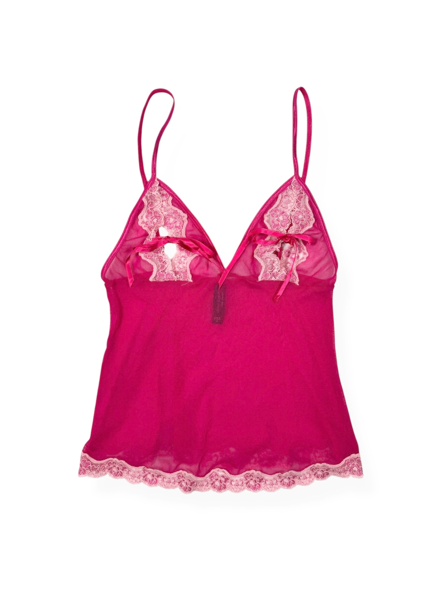 Adorable 00s Victoria’s Secret pink micromesh cami🩷Lace details with satin ribbon tie bust🩷
