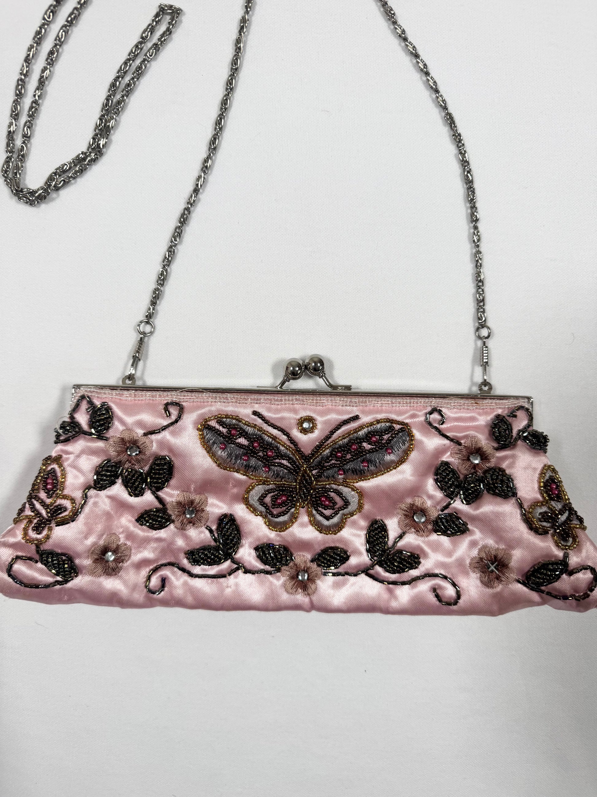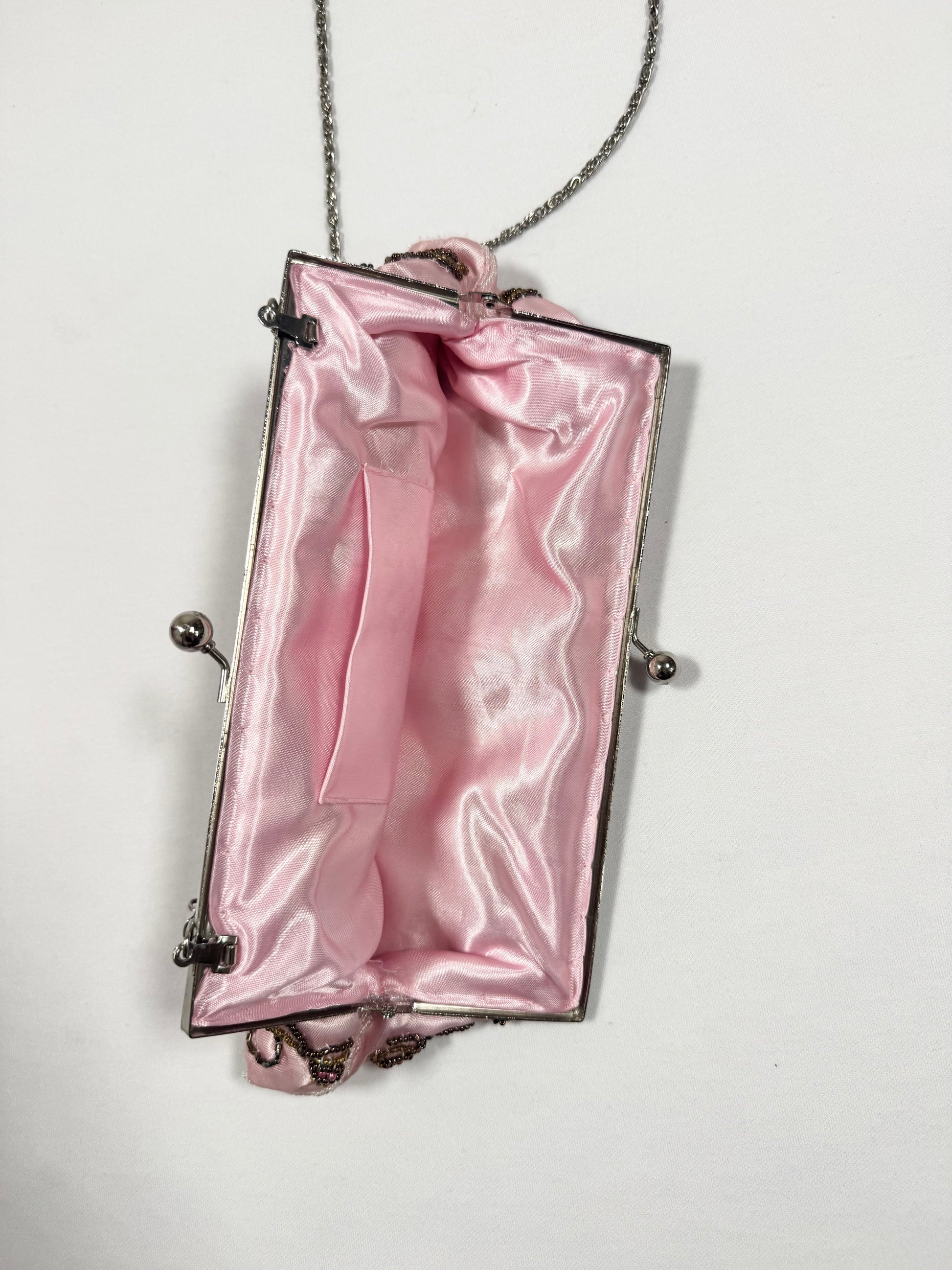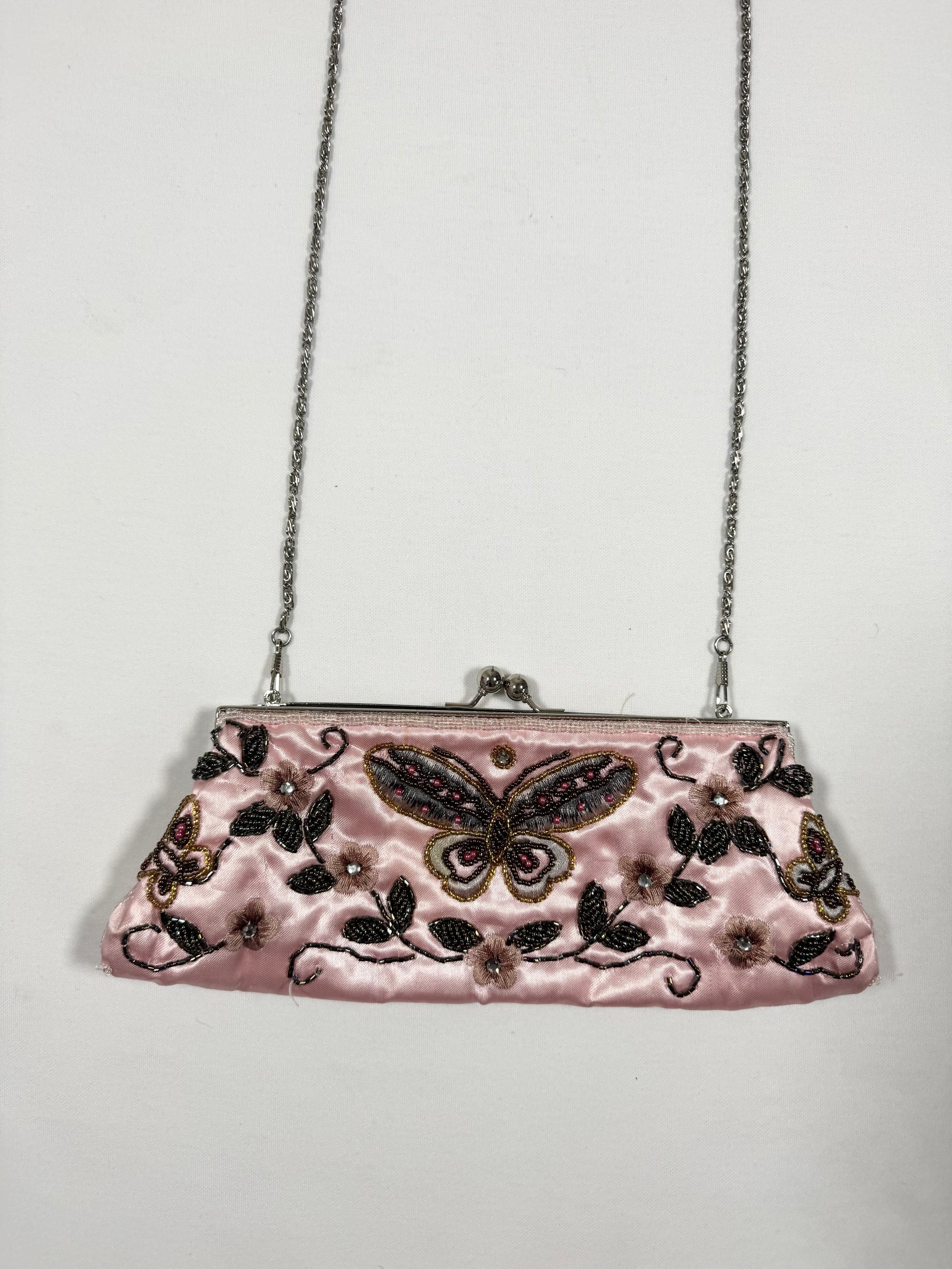 Gorgeous vintage 90s pink satin purse with beaded butterfly design🤍
