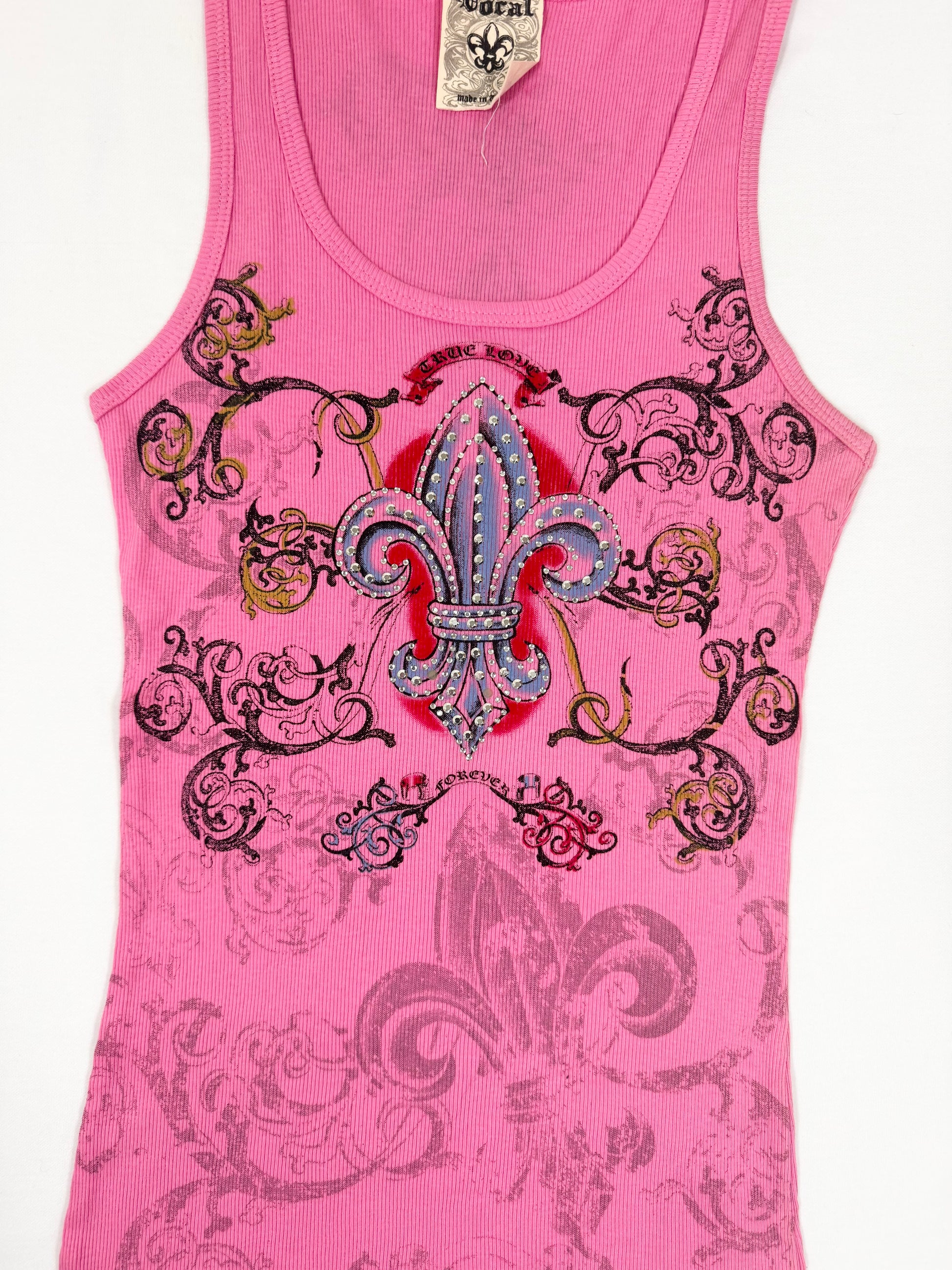 Super cute 00s “Vocal” light pink tank with blue Diamante cross💗Crosses up the centre of the back💗