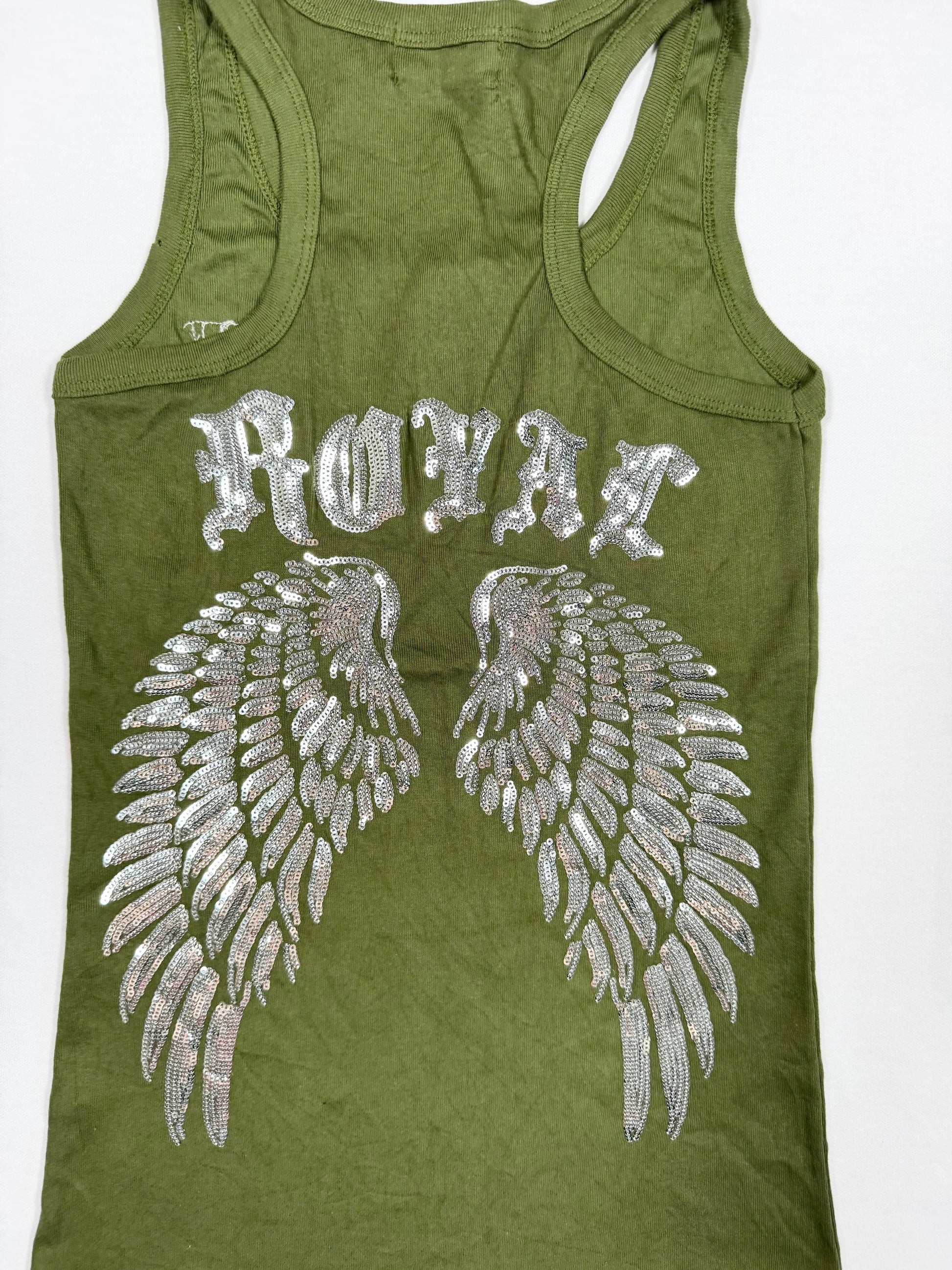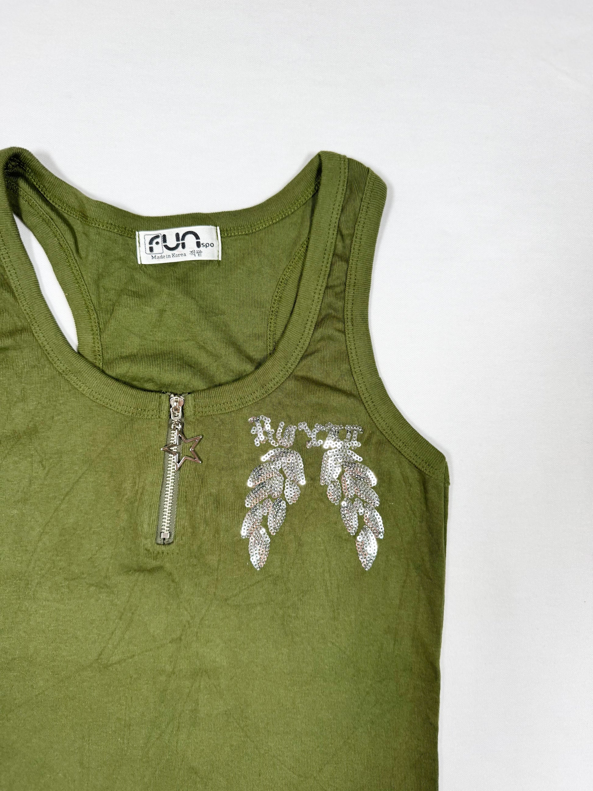 Cute 00s green tank with silver sequin wing designs🤍Star zip up front🤍