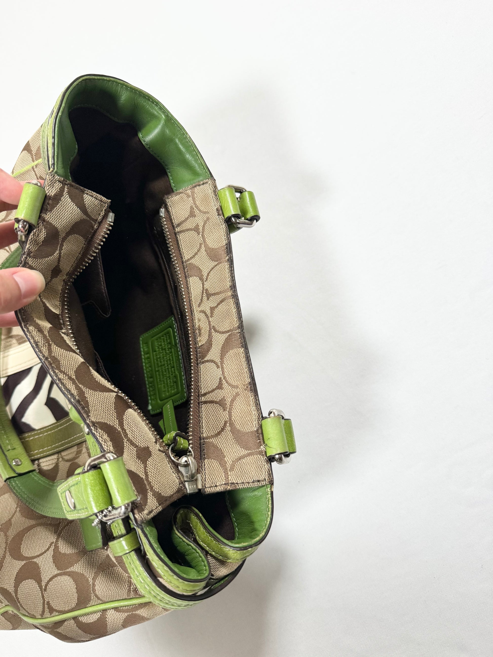 Super cute and unique 00s coach bag in signature brown logo print fabric and green leather straps🤎Zebra print panel on the front🤎